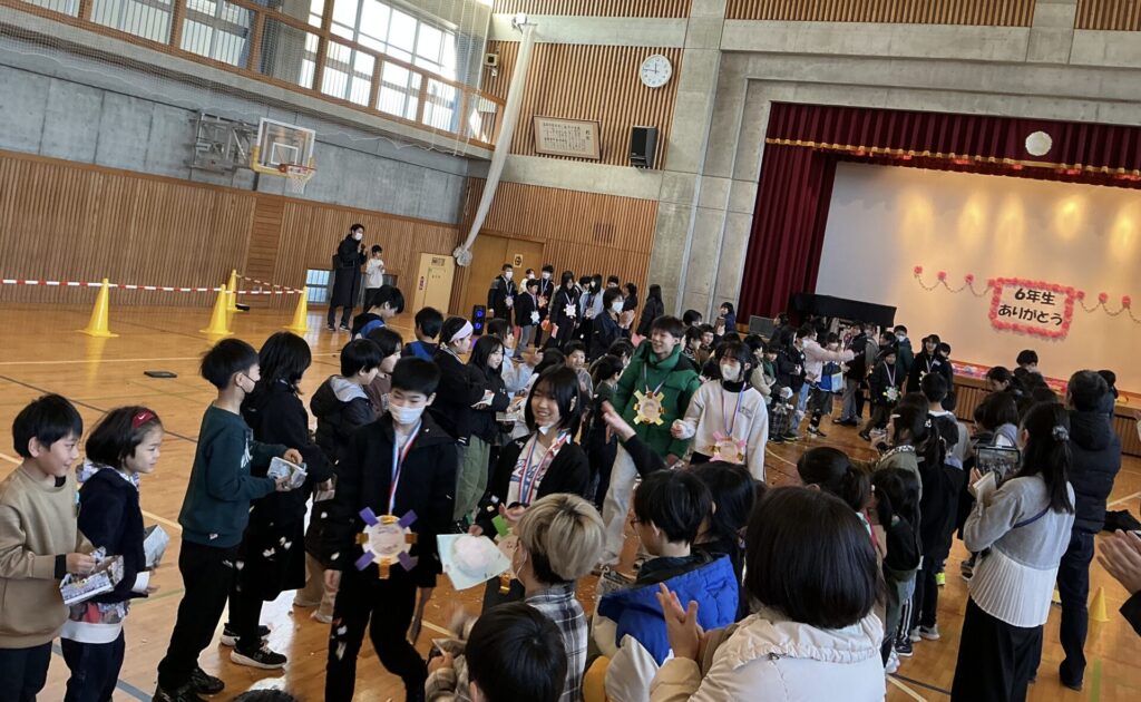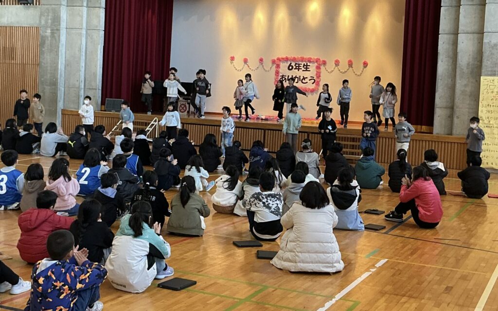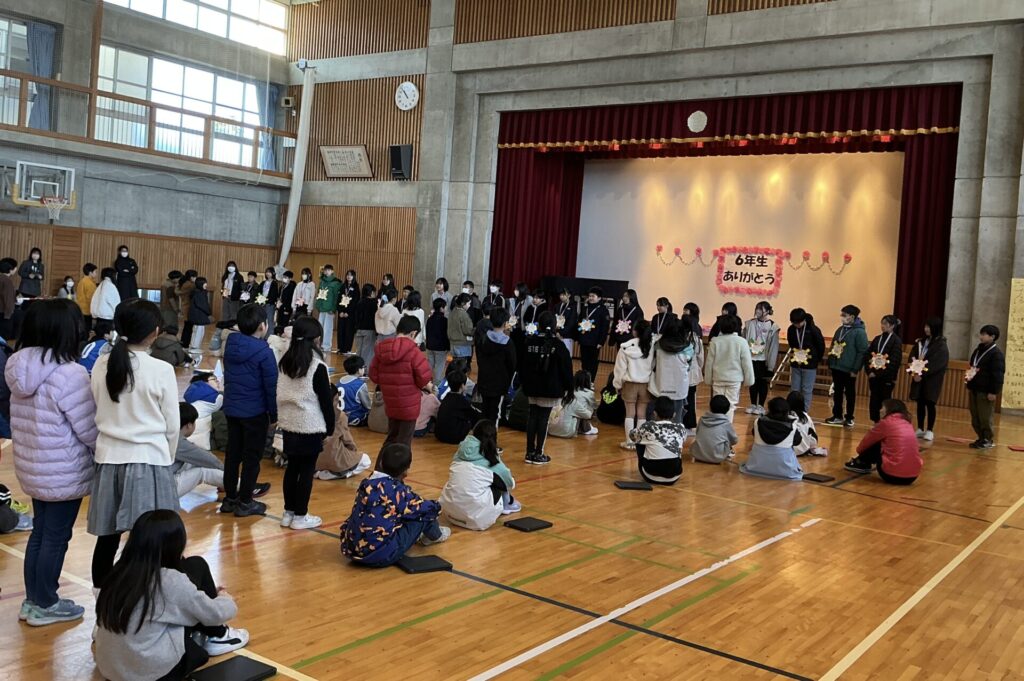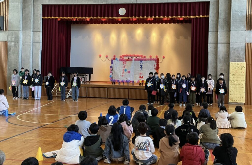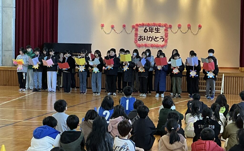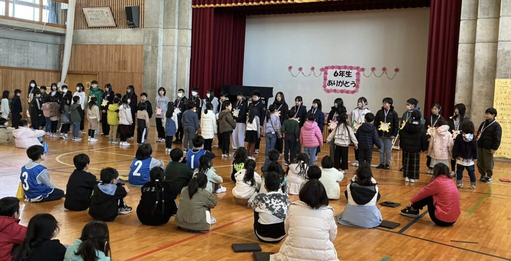 学級閉鎖がようやく終わり、全学年参加の6年生を送る会を行うことができました。