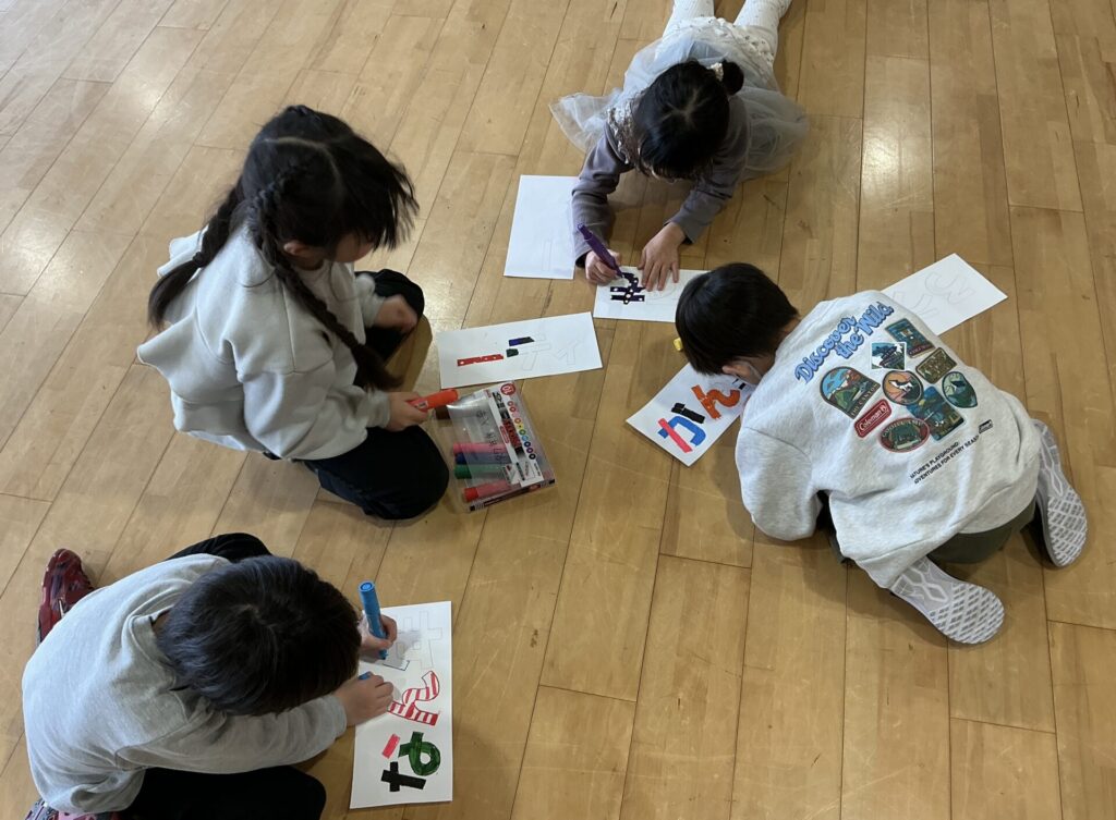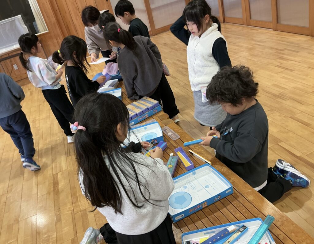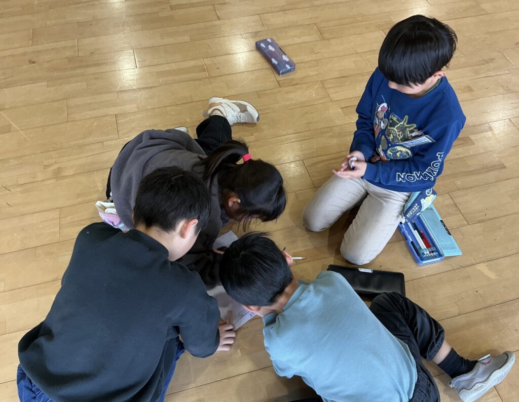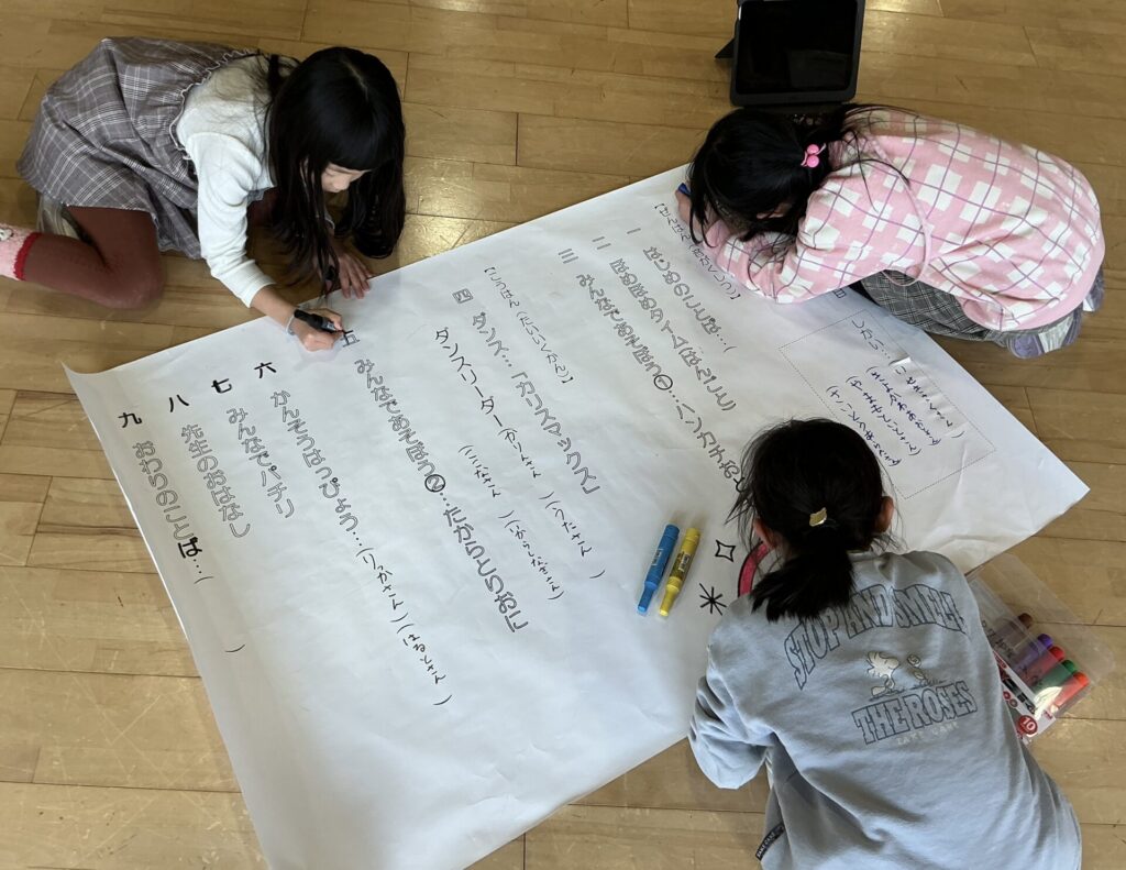 であいの広場で、1年生がお楽しみ会の準備をしていました。