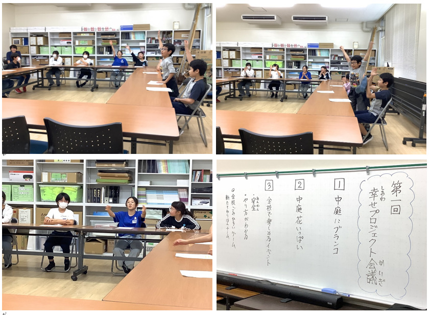 学校経営方針「幸せな気持ちになれる学校」の実現を目指し,全校児童へのアンケート結果から選出された児童の発案を実現するための話し合いが行われました。2年生児童からの幸せ提案1「ブランコを増やしてほし …