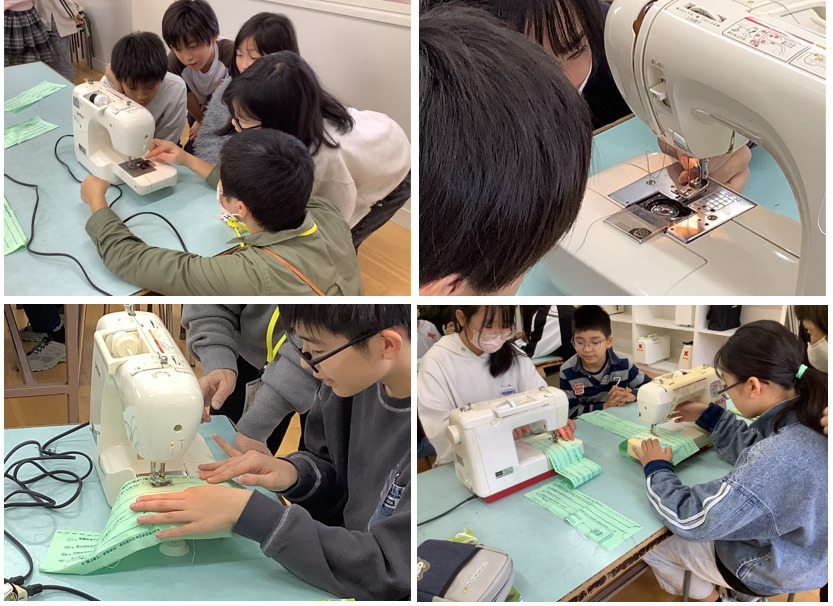 5年生は,家庭科学習で初めてミシン縫いに挑戦しました。6つのグループに分かれ,それぞれに一人ずつ地域のミシンボランティアさんについていただきました。上糸と下糸の糸の通し方や,ミシンの操作の仕方を丁 …