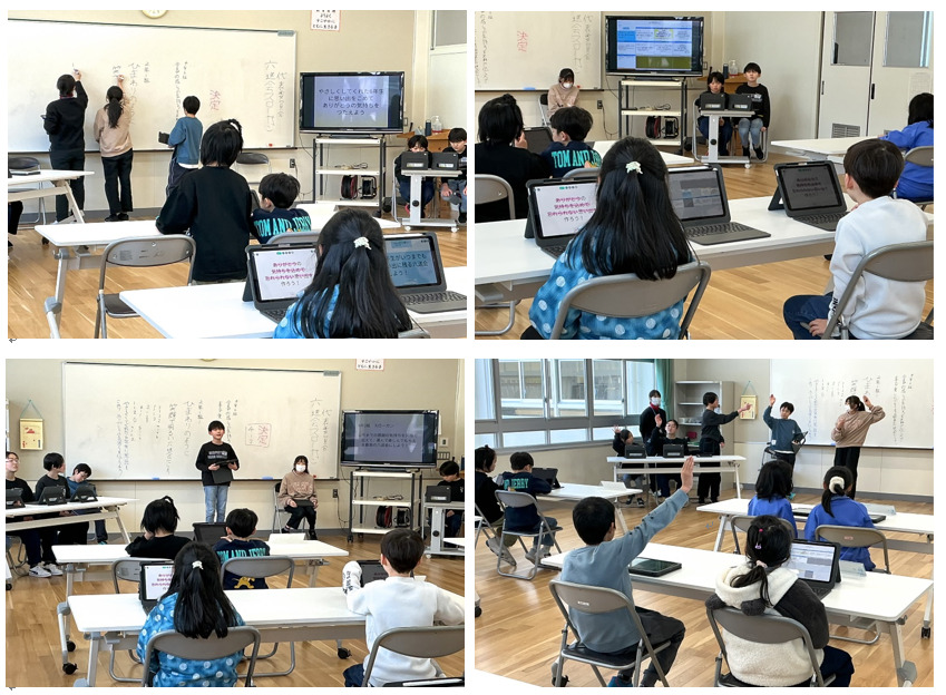 1年生は,図画工作で,紙コップの積み方や並べ方を工夫して"紙コップランド"をつくりました。手や体全体の感覚を働かせ,自分の背丈ほど高く積み上げるグループ,中に入れるように丸く並べるグループなど,高さや大きさ,形など,いくつもの工夫を組み合わせ,夢中になって楽しい"紙コップランド"をつくる姿が見られました。その出来上がるまでの様子をiPadで録画した各グループの映像をコマ送り再生で振り返り,それぞれの造形の面白さや楽しさ,つくり方など,お互いのよさについて発表し合いました。また,自分が工夫したことや他のグループのよいところについて,一人一人がiPadに書き込んでいました。