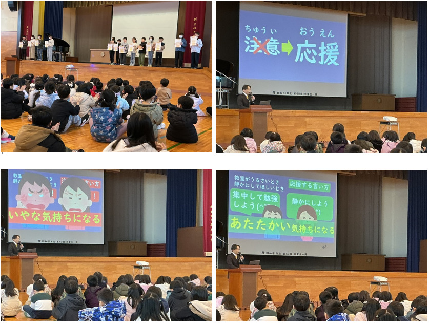 「六年生を送る会」の始まりは,1年生による6年生紹介でした。1年生が6年生一人一人の名前を紹介すると,ステージ上に登場した6年生が思い思いのポーズを決めて応えてくれました。6年生に一番お世話になった1年生は,この1年間を振り返り,感謝の気持ちを言葉とダンスとプラカードで表現しました。「 6 年 生 あ り が と う 」