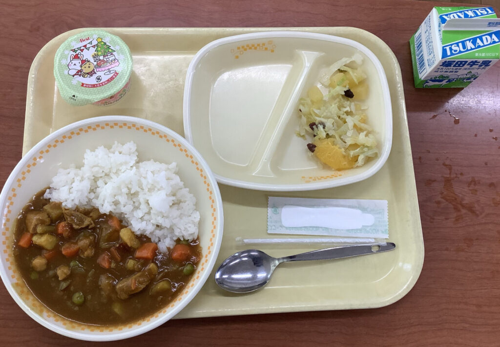 12月18日にクリスマス献立がありました。 メニューは、ごはん、ダブルポテトカレー、フルーツサラダ、いちごのクリスマスデザート、牛乳でした。 カレーにはチキンが入っていて、クリスマスらしさが感じられまし …