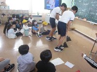 後期の清掃が始まります。その際、班ごとに集まって清掃指導をするわけですが、清掃部担当が中心となり、全校で同一歩調を目指した指導を行っています。先生が変わっても清掃場所が変わっても子どもは困ることなく清掃ができる仕組みになっています。そして、指導をするのは、その場所のリーダーである6年生としています。6年生はリーダーとしての自覚をもち、みんなに伝えてくれています。その清掃場所の担当職員が、6年生を勇気づけ、価値づけながら、内容を確実にすべての子どもたちに伝えています。