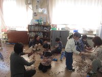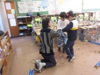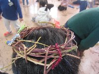 1年生が育ててきた朝顔のつるを使ってリースを作ります。しかし、簡単ではありません。つるはぐるぐると育ち、簡単にはほどけないのです。つるをまとめるのも跳ね返ってくるので難しいのです。たくさんのボランティアの方が来てくださったので、できあがるリースです。みなさんがいなければリースはできませんでした。本当にありがとうございます。