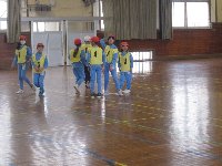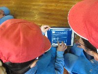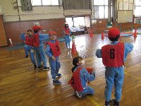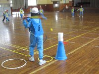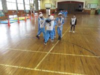 体育でティーボール型ゲームをしている学級です。打者がボールを打つと、守備のみんながボールを追いかけ、誰かが取ったらマークしてある場所に全員が集まるとそこまで進塁が終わりというゲームです。ボールをバットで打つ技術、全速力で走る運動、カーブを走りながら曲がる技術、ボールを追いかける運動、ボールを取る技術などを身に付けます。