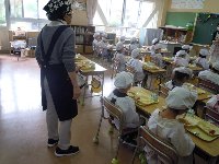 1年生の給食が始まりました。事前に担任が、給食の流れについて説明し、個々の役割を教え、具体的なやり方を説明しました。よーく聞いていた1年生の子どもたち。ボランティアの皆さんの温かなサポートも加わり、準備も、食器の使い方も、片付けも上手にできました。