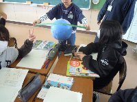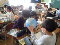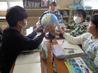 学級開きから数日間、学級の基盤づくりをしました。その後、すべての学級で学習が進んでいます。この学級は、社会の学習で、地球儀の球面から日本から外国までの距離を測っています。曲面ですから、定規では測れません。さぁ。どうするのか!