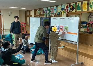 小学部6年生は、「open shut Them」の歌に合わせてふりを入れて歌ったり、英語で示された動物カードを使ってカルタをしたりしました。カルタを取るたびに歓声が上がり楽しく活動することができました。