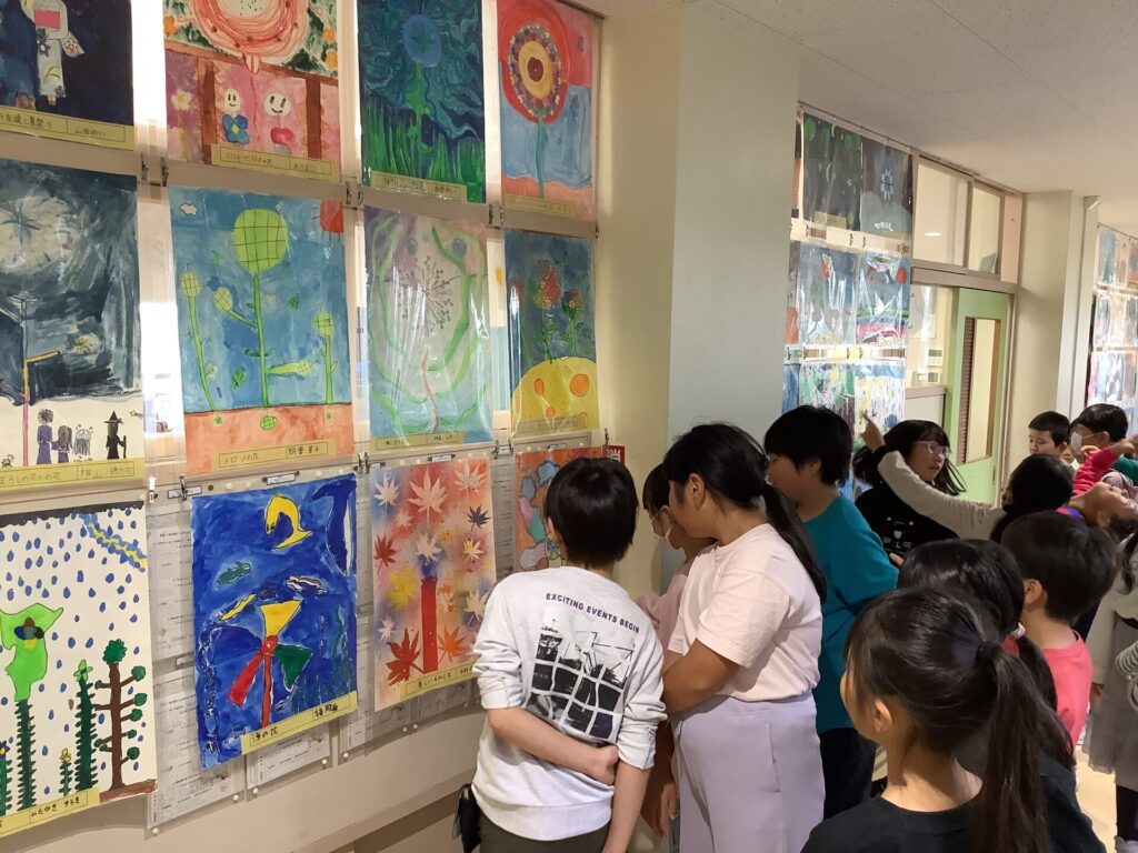 今日まで前学級の廊下に絵画作品が展示されました。子どもたちは、授業の中で全校の作品を見て回りました。