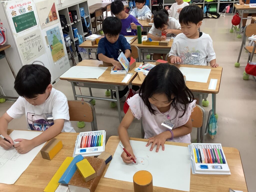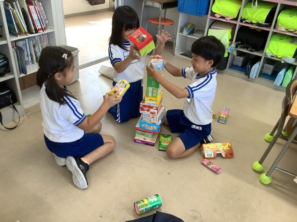 算数の学習で、身の回りにある形を仲間分けしたり、高く積んだり組み合わせて形を作ったりすることを通して、立体図形について学んでいます。箱の形から、四角や丸といった形の違いや、平らな面があることに気づくことができました。自由に発想しながら、楽しく学習する様子が見られます。おうちの方から空き箱の準備にたくさんご協力いただき、ありがとうございました。