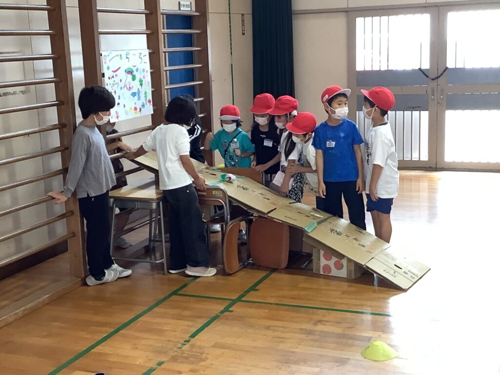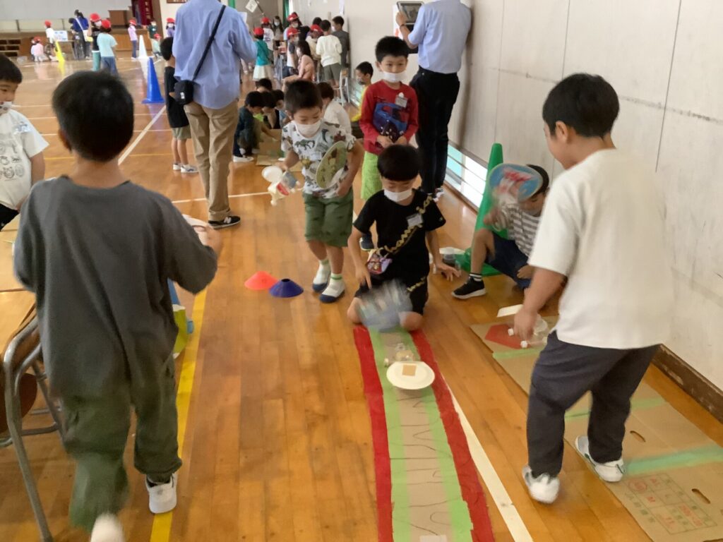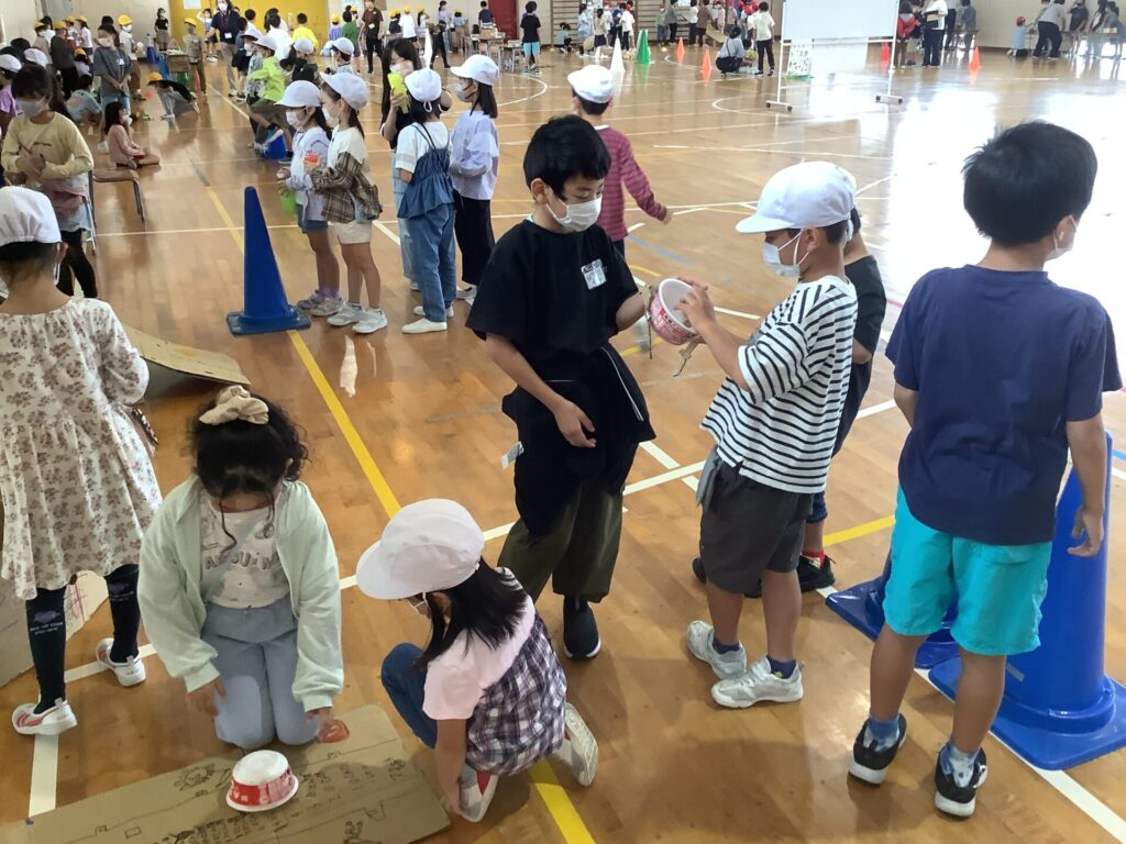 10月8日(水)の1・2時間目に、2年生がおもちゃランドを開き、1年生を招待しました。2年生は今日まで、生活科の学習でおもちゃづくりやお店の準備に取り組んできました。「もっと上手く動くようにするにはどうしたらいいかな」と、工夫をしながら作ったおもちゃで、1年生をおもてなしします。遊び方を教え、「上手だね」、「すごい」などと、優しく褒めながら、お兄さんお姉さんとして頑張る姿がたくさん見られました。1年生がとても喜んでくれたことで、「楽しませてあげられてよかったな」、「僕たちも楽しかった」という感想が聞かれ、おもちゃランドは大成功でした。