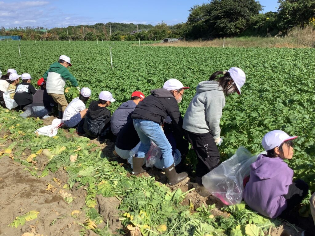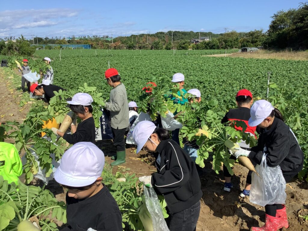 素晴らしい秋晴れの中、大根収穫体験をしました。JA新潟かがやきすいか集出荷場で、説明や質問を受けていただきました。「想像していたよりも大きかった」「重かった」という感想が出ました。葉っぱまである立派な大根を持ち帰りました。どんな大根料理になるのでしょうか。楽しみです。