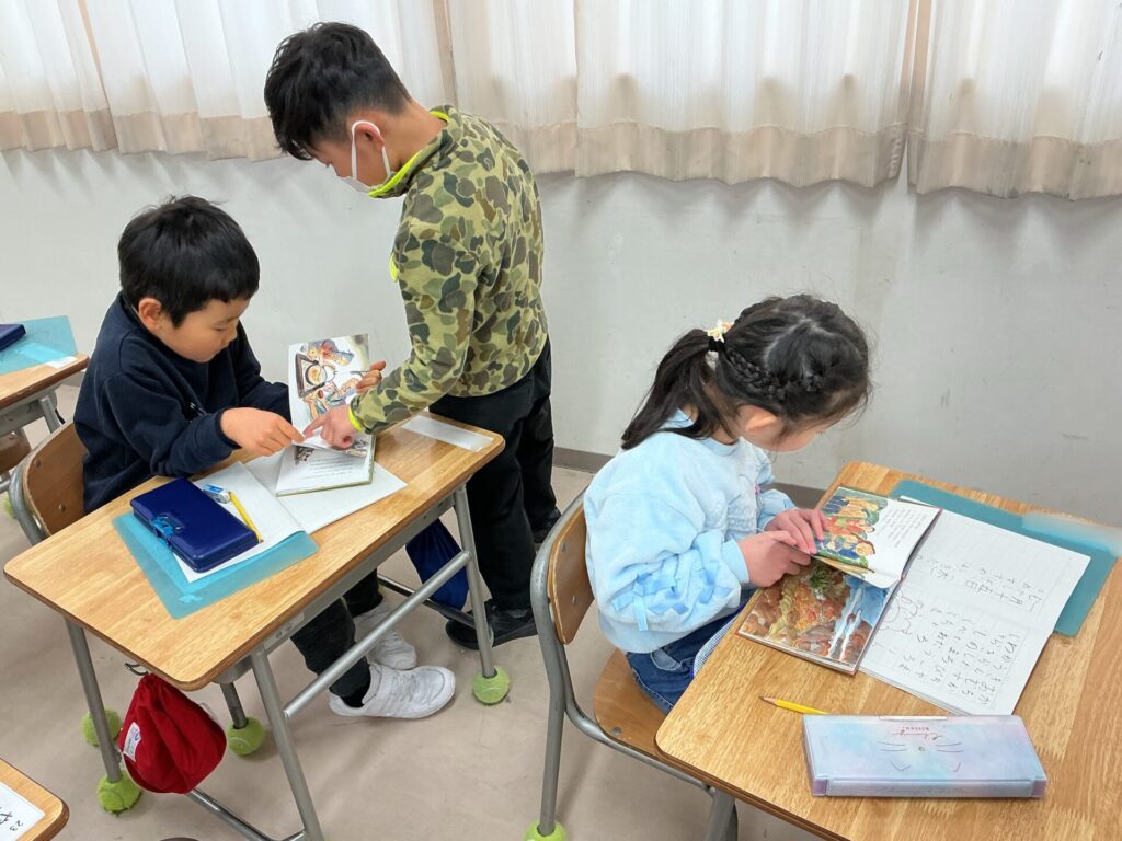 国語の学習で、日本に古くから伝わる昔話を読んだり、オリジナルのお話を書いたりする活動を行っています。図書館司書の五十嵐先生から読み聞かせをしてもらったり、教室で昔話の絵本を読んだりしました。現在は、昔話をもとにしてお話を作っています。読書は、学力の向上につながることはもちろんのこと、子どもたちの心を育む活動です。今後も、学校図書館と連携をとりながら、学習を進めていきたいと思います。