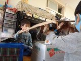今日の年中さんは,段ボールを使って坂道を作りました。そしていろいろなものを転がします。 ペットボトルのキャップ。ガムテープや紙テープの芯。楽しくなってきた子どもたちは自分も坂道を転がりました。 つぶれ …