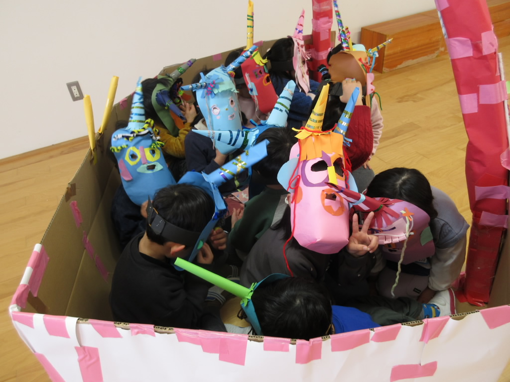今日は幼稚園で豆まきをしました。 みんなが遊戯室に集まる前に・・・鬼に変身した年長組の子どもたちが、鬼ヶ島にそっと隠れていました。みんなが集まると・・・絵本『こぶじいさん』の歌に合わせて、鬼が楽し …