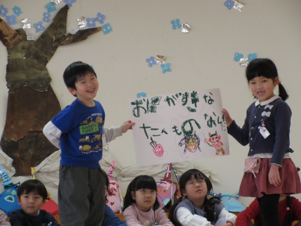 豆まきの会では、年長組が考えた「鬼にまつわるクイズ」がとても楽しく、大盛り上がりでした。 みんな、わかるかな・・・?