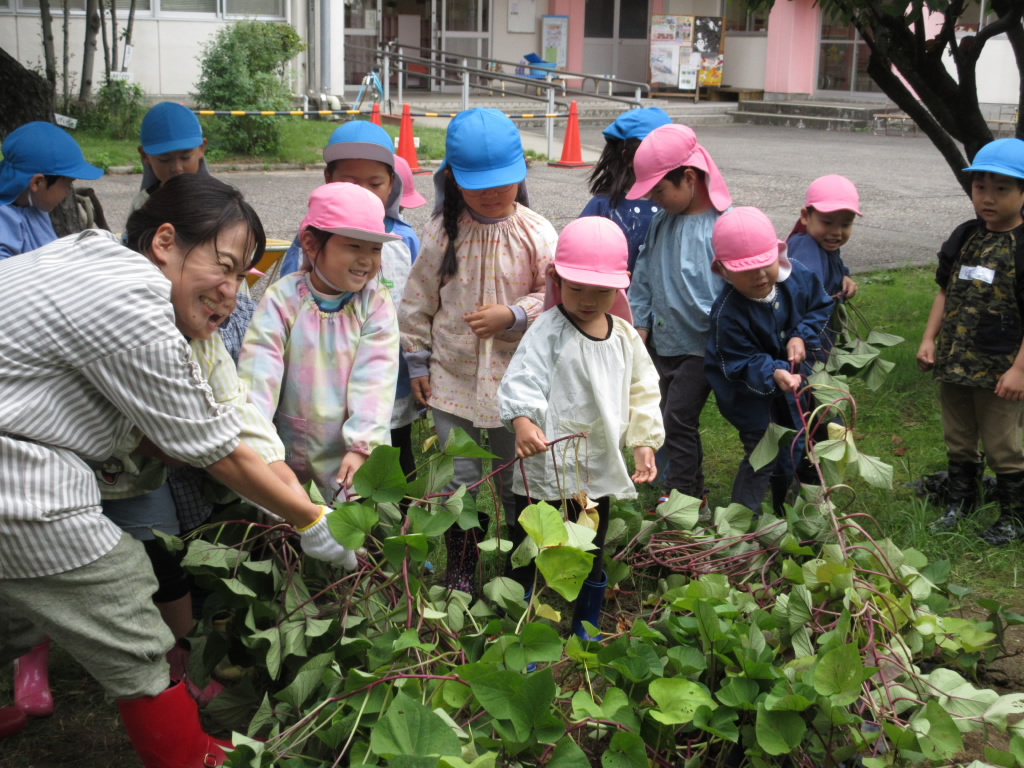 年中組を中心に、春先から大切に育ててきたさつま芋の収穫をしました。「やったー、おいも掘りだ!」とうれしそうな掛け声でスタートしました。昨年の経験を年長組の子どもたちに教えてもらいながら、みんなで楽し …