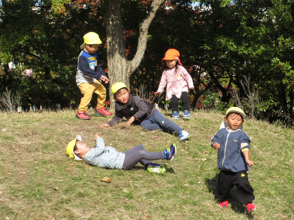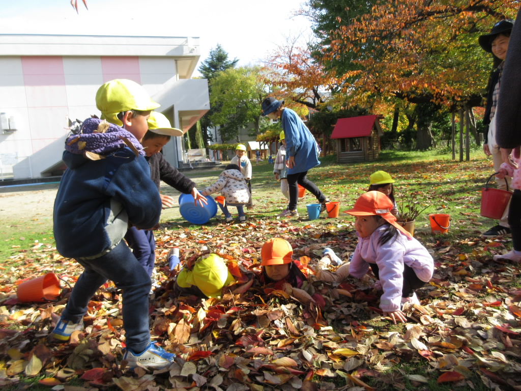 幼稚園の園庭は、今まさに見事な紅葉です。子どもたちは、毎日園庭へと出かけ、赤や黄色の葉っぱと全身で戯れて遊んでいます。落ち葉の中に隠れてみたり、集めたり、紙吹雪のように降らせてみたり・・・遊び方は様 …