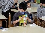 重ねた着物をびんの周りにつけていきます。よく見て,ていねいにつけています。どんなおひなさまができるかな。たのしみです。