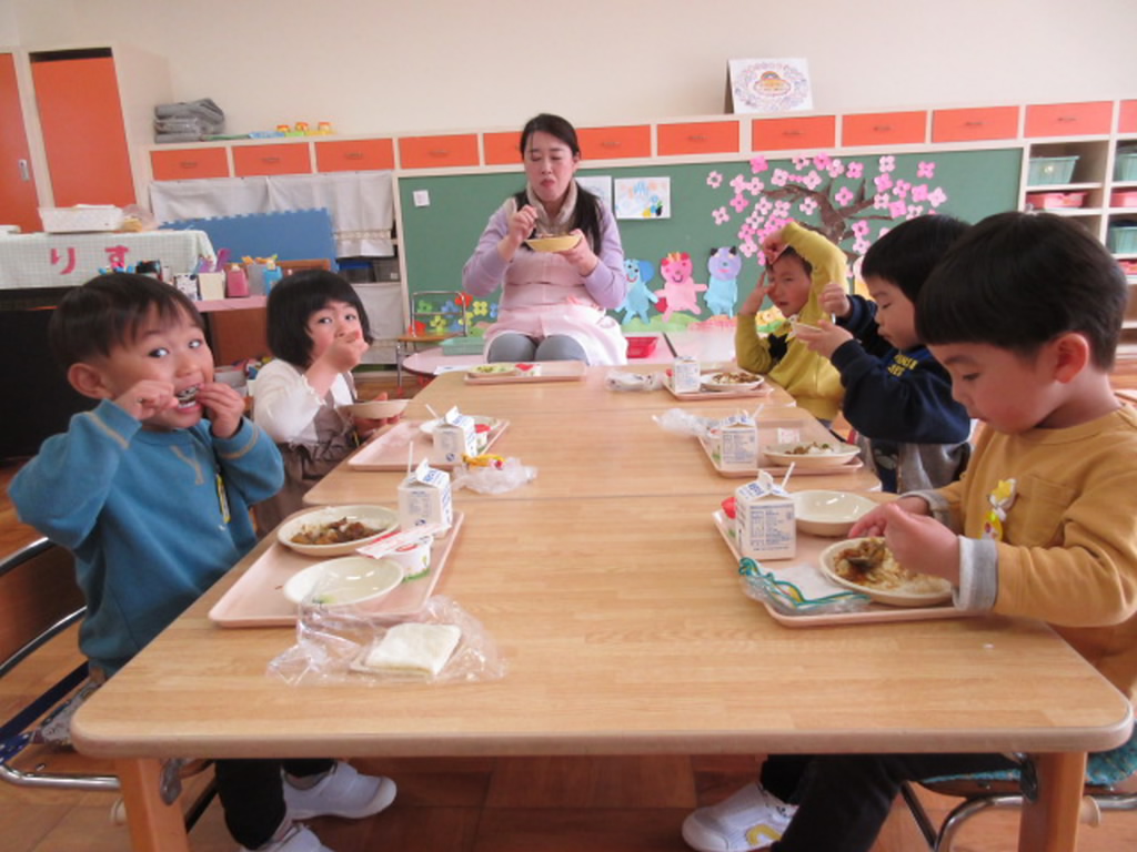 「あっ、給食のにおいがするね!」「今日は、ゼリーがあるよ。」「やったー、カレーだ。」とお昼近くになると、声が聴こえてきます。進級・入園して一つ大きくなった子どもたちは、張り切ってもりもり食べています。