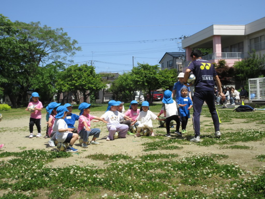 先日、グランセナのコーチと一緒にサッカー遊びを楽しみました。まずは、全身のいろいろな部分を使ってボールにふれ、動きを楽しむところから始めました。友達と一緒、コーチと一緒という安心感の中で、一人一人が自分のペースで試してみることができました。サッカーっておもしろい!