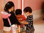 外遊びからもどってきた子どもたちが,給食のもりつけサンプルを見ています。「今日は何かなー」「おいしそうだなー」子どもたちの大好きな沼垂幼稚園のおいしい給食です。