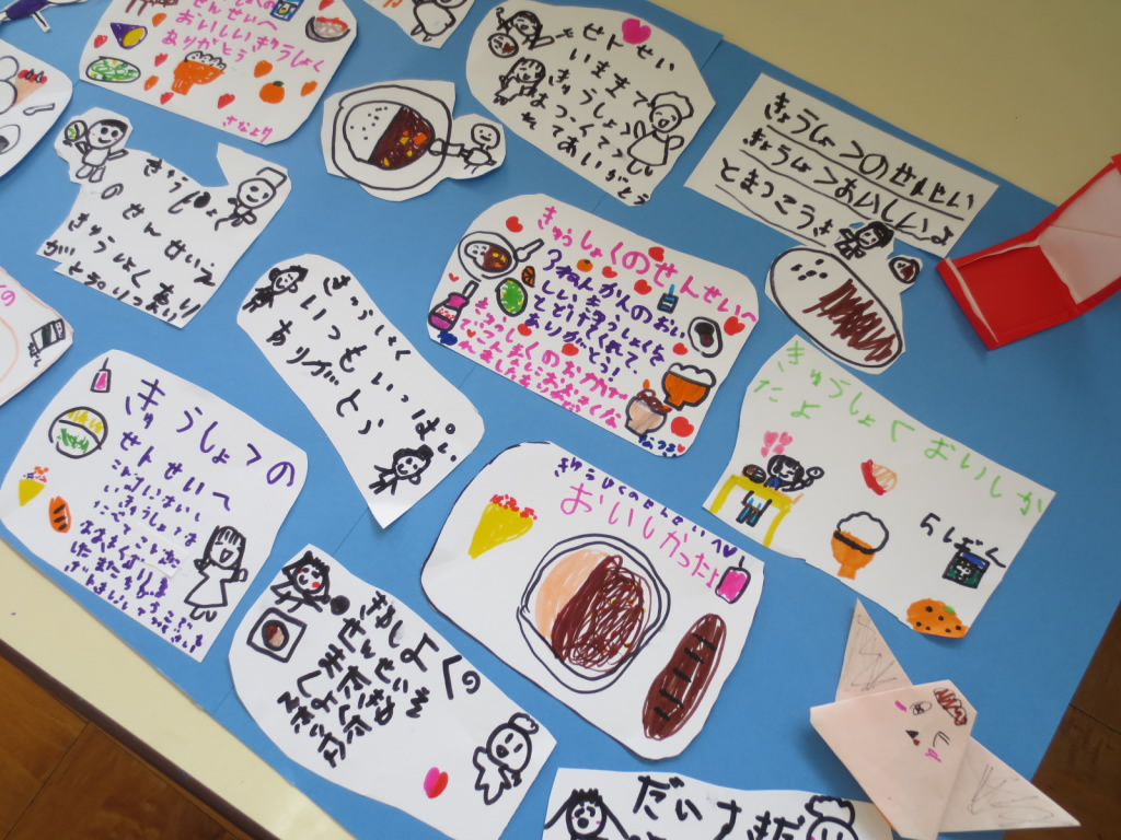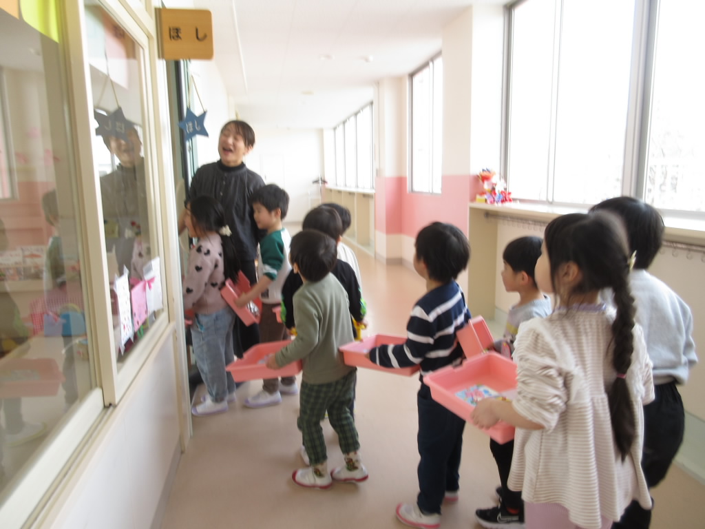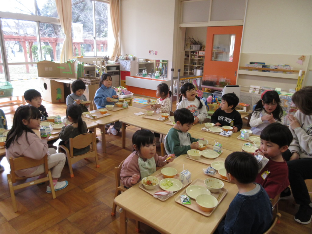 実習生と集団遊びを楽しみました。♪猛獣狩りにいこうよ~!と口ずさみながら遊びがスタートします。次々に動物の名前が出てきて、動物の名前の文字数でグループを作ります。文字や数遊びにつながる、年長組ならではの楽しい遊びです。遊びの中で、文字や数にふれ、興味をもっていく姿を大事にしています。