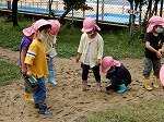 雨の日の園庭で,いろいろなことを見付けました。「木の枝から,また雨が降ってきたよ。」「道がどろどろになってる。」「この実は何かなぁ。」
