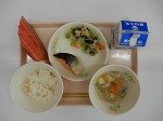 【6月30日のきゅうしょく】ごはん,こんさいじる,ますのしおやき,アーモンドあえ,ぎゅうにゅう,すいか