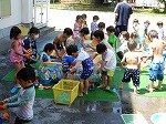今夏は,プールでの水遊びを行いました。年少組はビニールのプールやたらいを使って。年中組と年長組は,プールでの水遊びです。