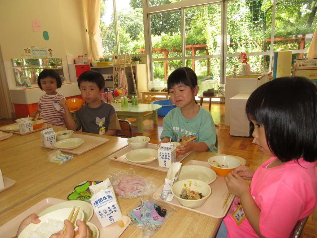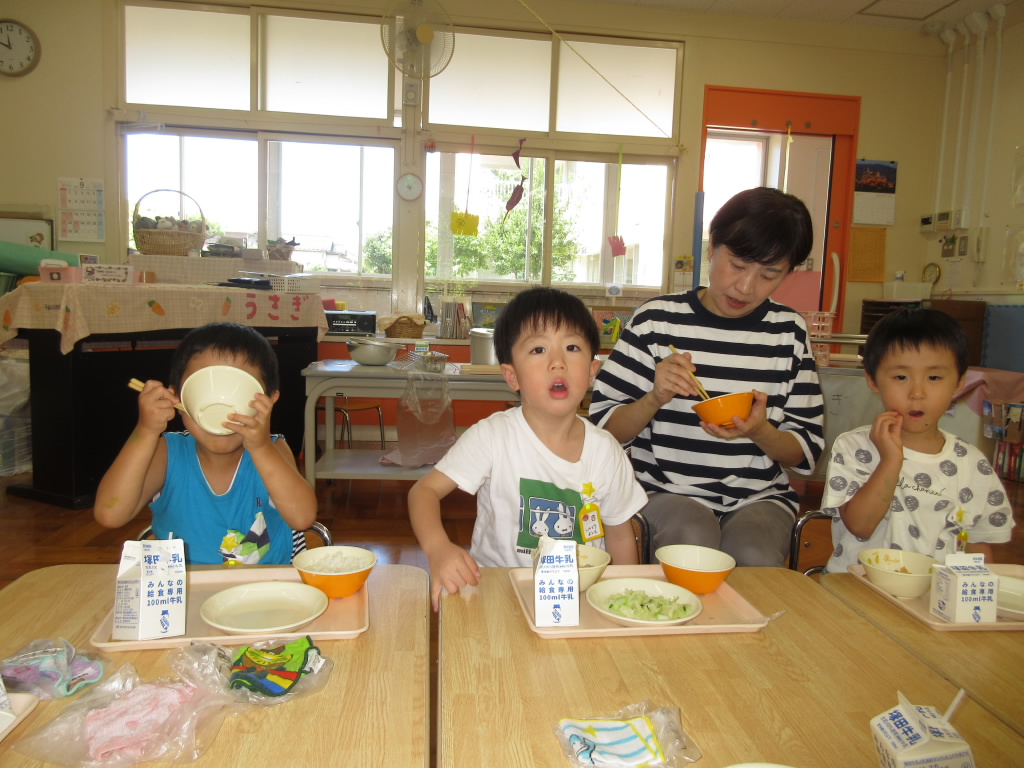 今日の給食なーんだ?と毎日のお楽しみ給食です。初めて食べる食材がある年少組の子どもたちは、担任の先生に「これなーに?」と聞きながら口にすると、そのおいしさにびっくり!