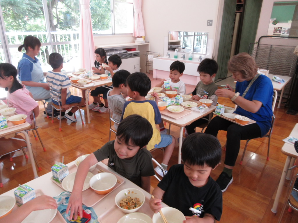年中組と年長組は、給食を合同で食べることもあります。その中で、互いの姿をよく見たり、会話を通じてより身近に感じたりする中で、給食がより楽しい時間となっています。