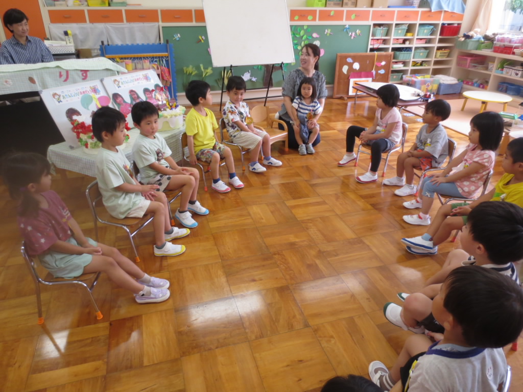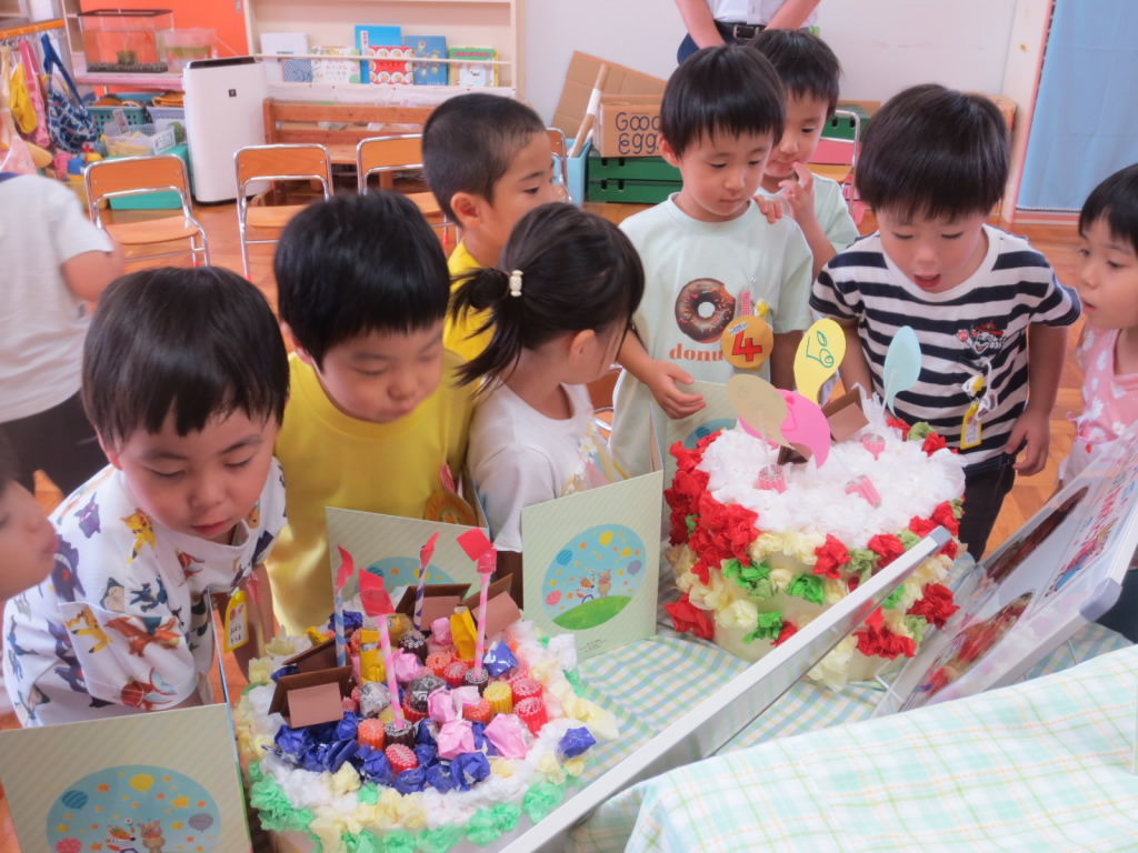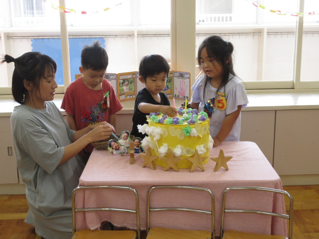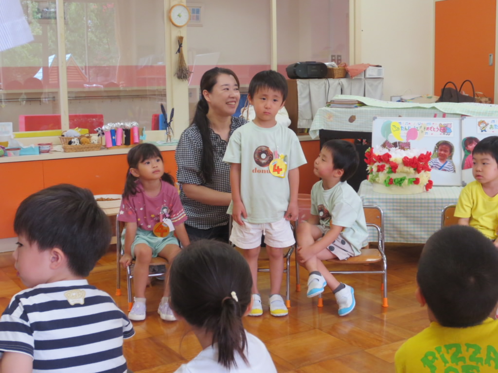 2か月に1度、誕生会を行っています。友達の誕生日をみんなでお祝いする、とってもとっても大切でうれしい誕生会です。誕生児だけでなく、お祝いするみんなが笑顔になります。