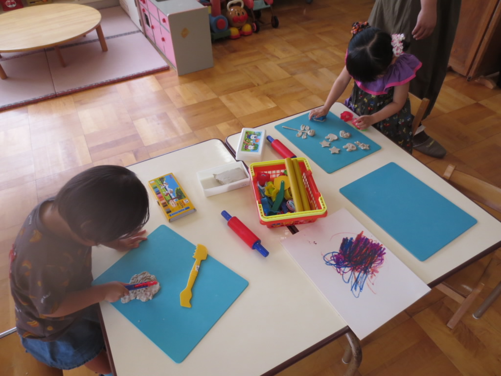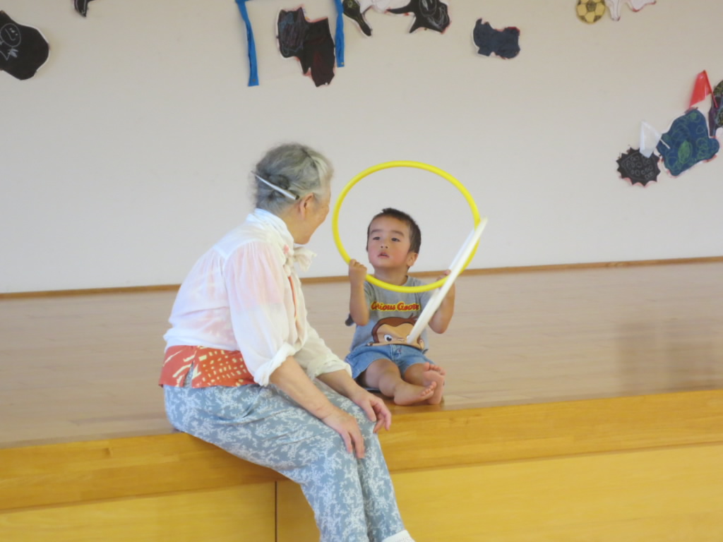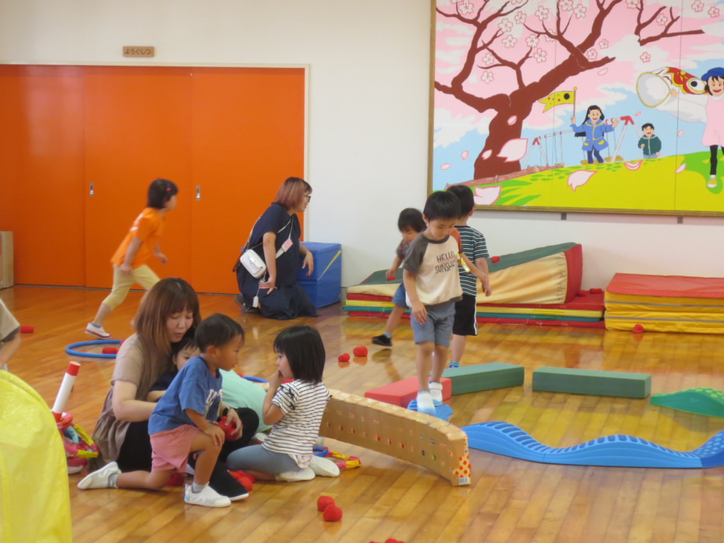 未就園児親子の会(つぼみ)のお友達と、年少組の子どもたちが一緒に遊びました。年少組の子どもたちは、自分たちより小さなお友達に優しく教えたり場所を譲ったり、つぼみのお友達は、年少組の動きをよく見てまねて遊んだりする姿が見られました。互いに刺激し合いながら交流する楽しいひとときとなりました。