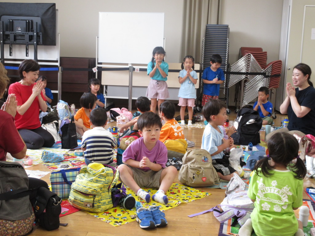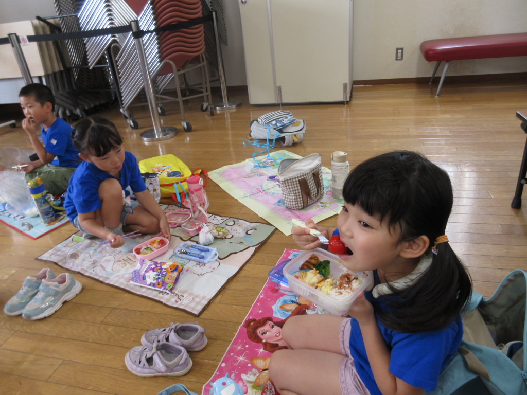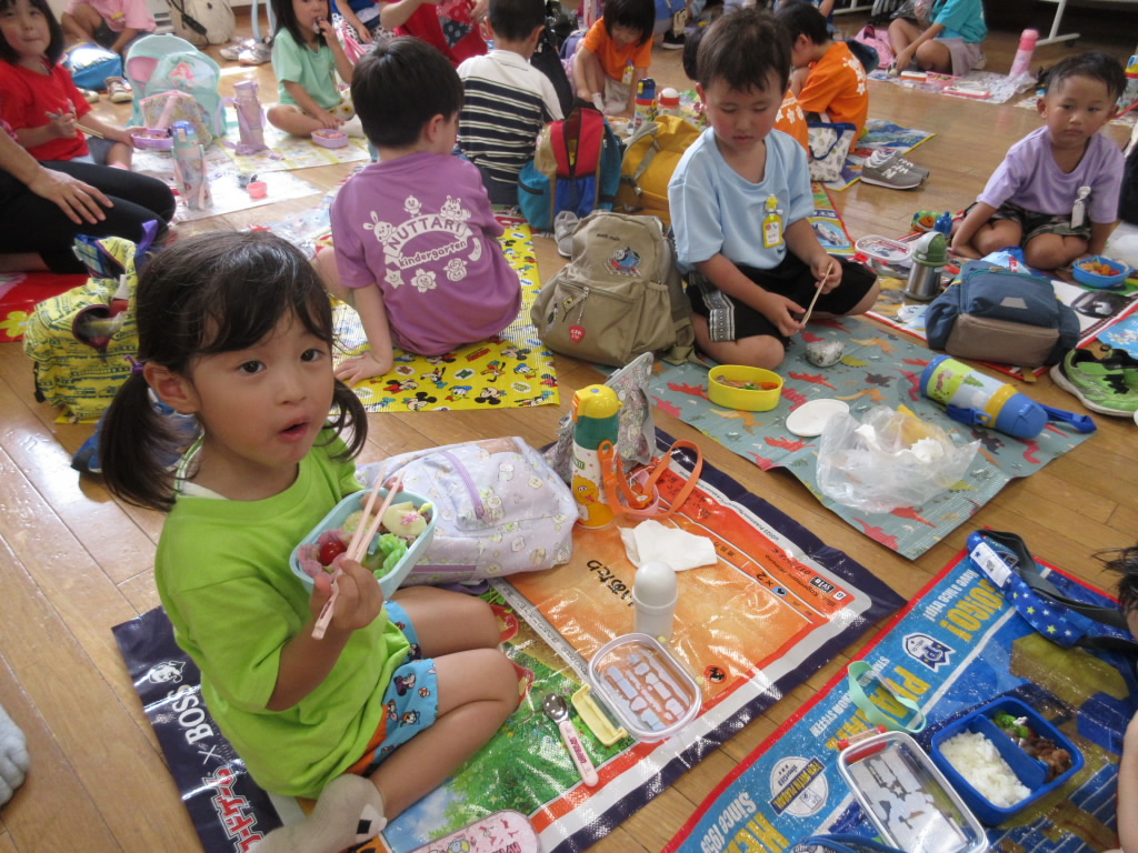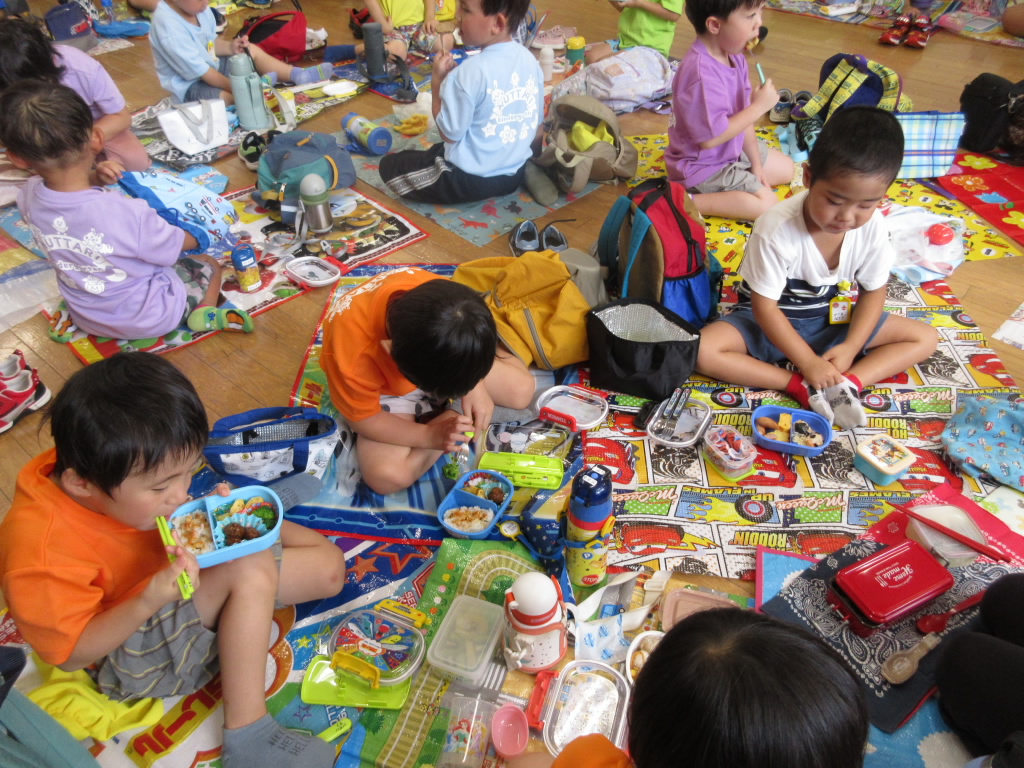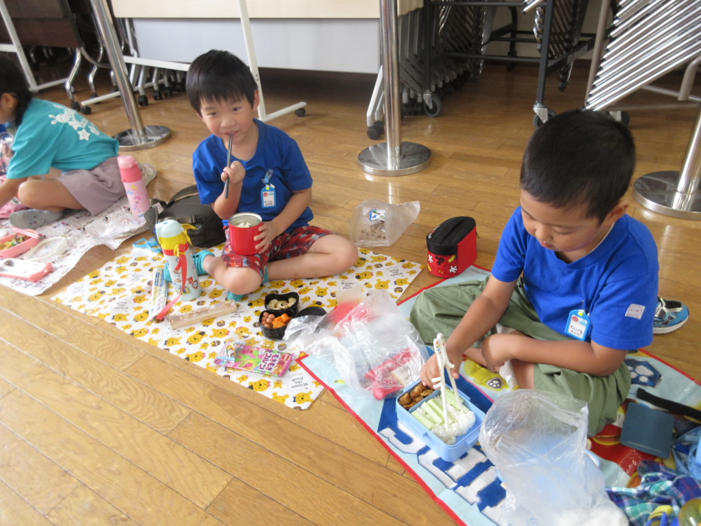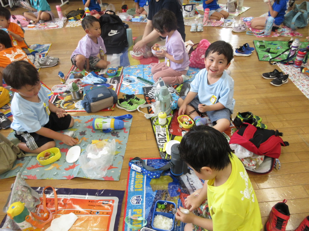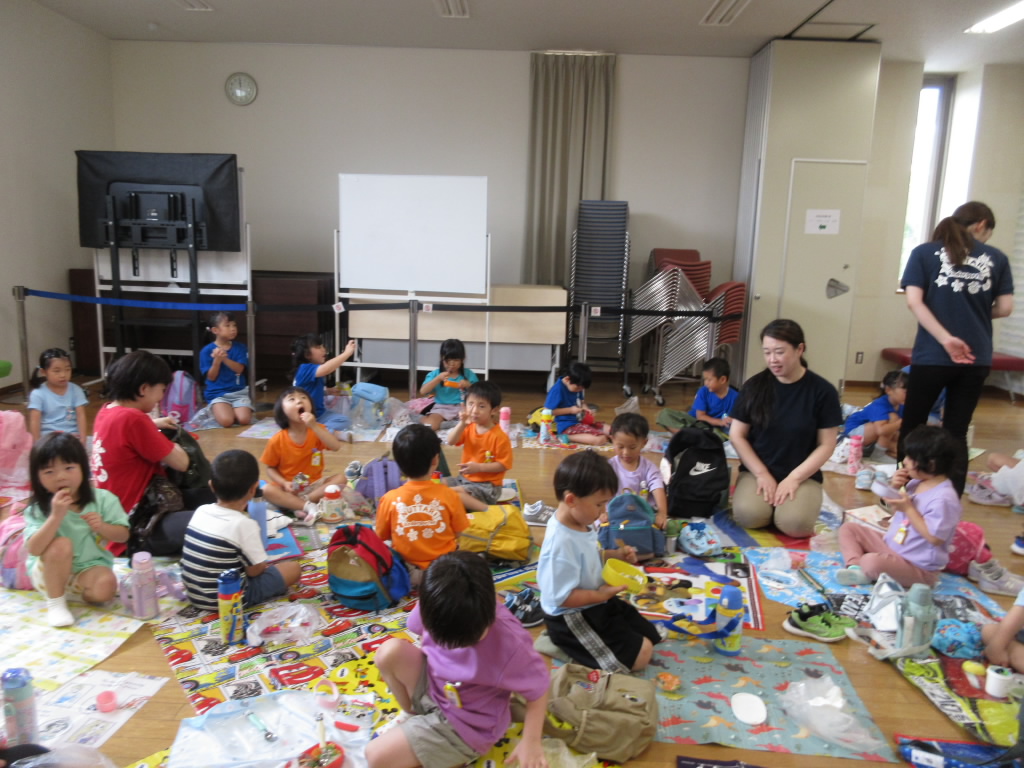 イルカショーの後は、待ってました!とお弁当タイムです。広い部屋の中で、みんなの顔が見えるようにシートを敷き、ピクニック気分で食べました。「見てみて!おいしそうでしょ。」「あっ、ぼくのおにぎりと一緒だね。」「タコさんウインナーがかくれんぼしてた。」と、おうちの方が作ってくださった愛情いっぱいのお弁当に、大満足でした。