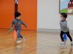 かっこいい年長さんのリレーの練習を見ていたので,走りたくなった年少組。リングバトンを持って走る 走る 走る。