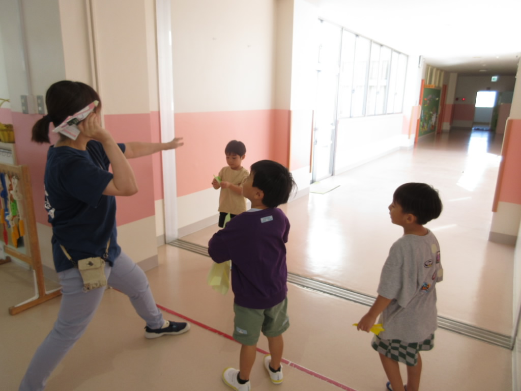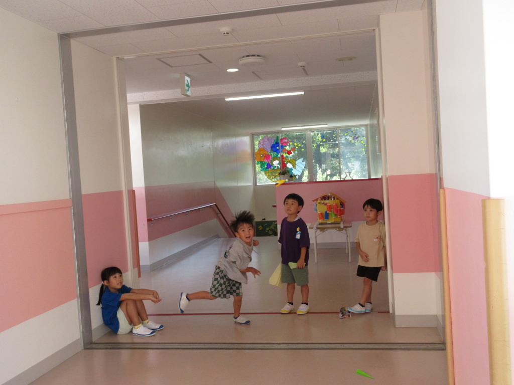 紙飛行機をいかに遠くへ飛ばせるか、試行錯誤中です。折り紙、チラシ、画用紙、新聞、いろいろな素材を試します。素材の次は、大きさです。作っては試し、試しては作る、年長組ならではの探究です。