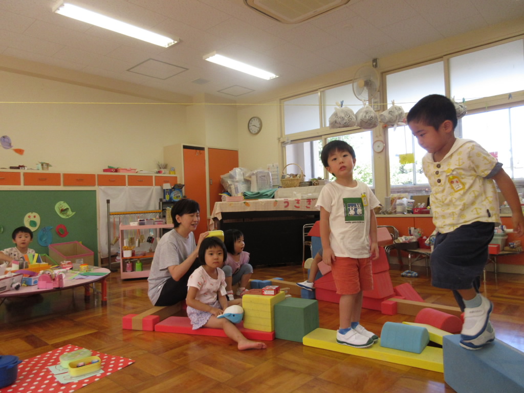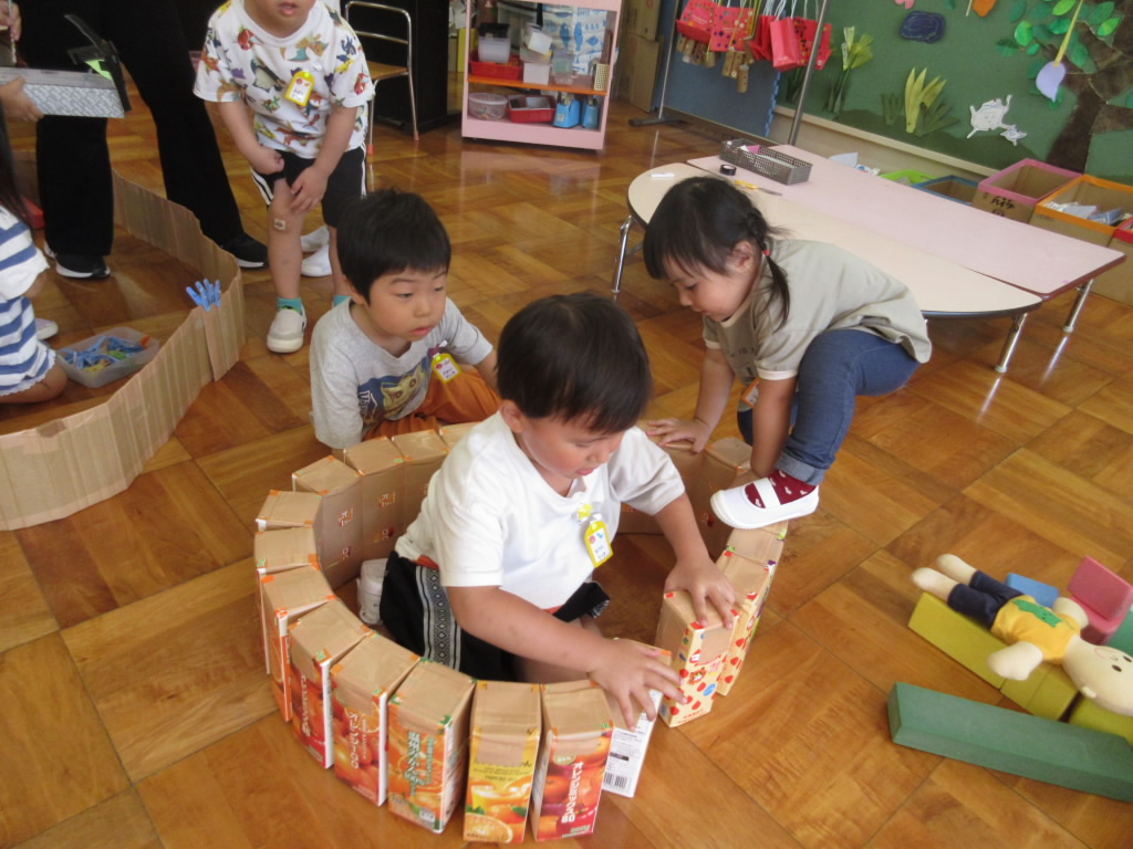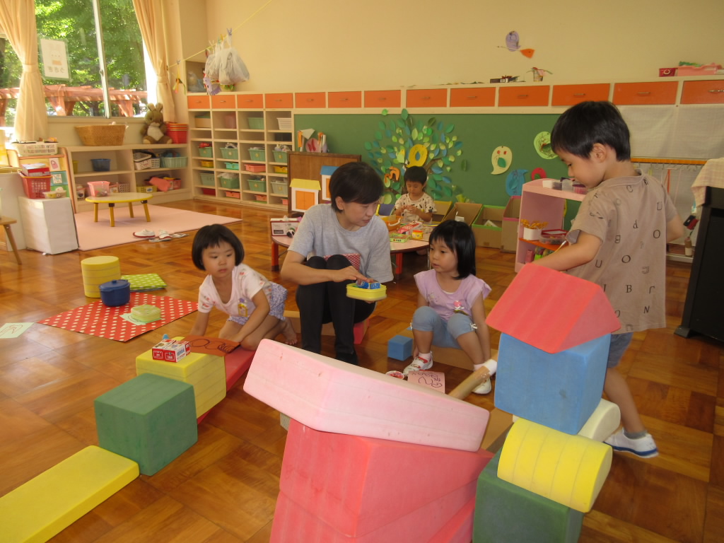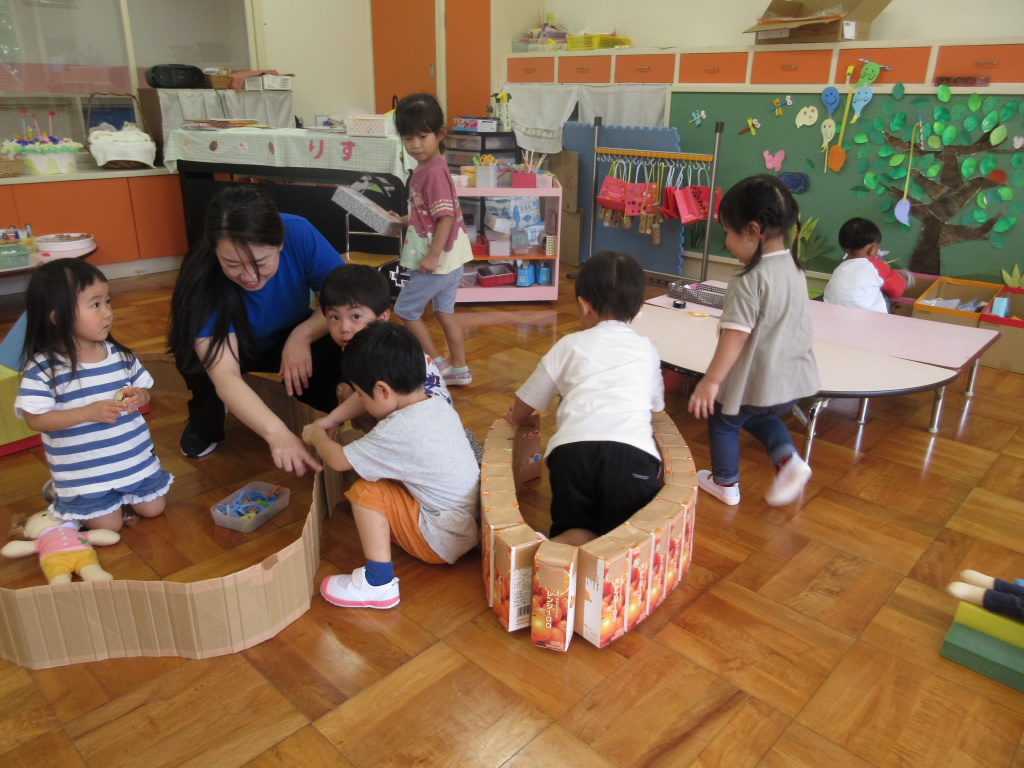 登園すると、安心して遊び始める年少組の子どもたちです。先生や友達が近くにいることで安心し、自分のやりたい遊びを見つけて遊びます。一人一人が安心できる居場所で、今日は何して遊ぼうかな・・・。