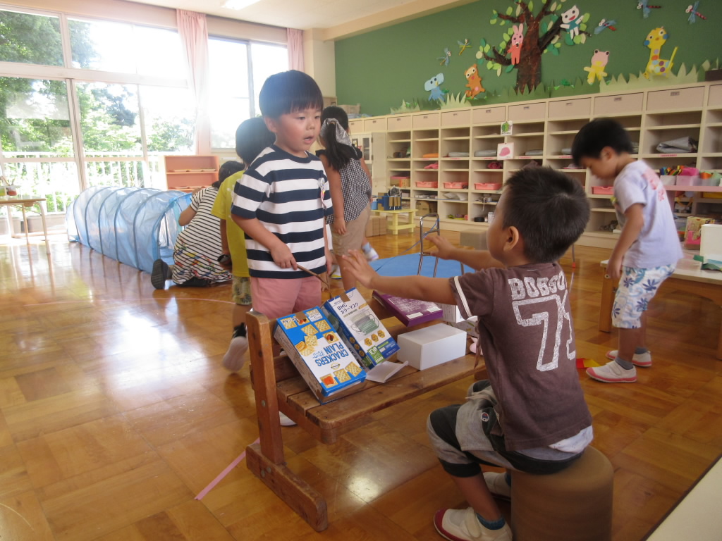 コンサートが始まった年中組。ボーカルにドラムと楽しい音が響き渡ります。いつでも自由にできる環境があるからこそ、のびのびとやりたいことに夢中になれます。