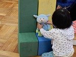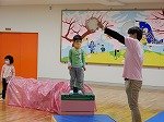 シャンプして「パーーン」タンブリンに手が届くかな。それっ。年中組と年少組が遊戯室で遊んでいます。高くジャンプする年中組を真似て,年少組もチャレンジ。