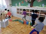 カラー積み木をつなげて,子どもたちが一本橋を渡っていきます。バランスをとってみんな上手ですよ。