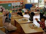 年少組は今日から給食が始まりました。おやつマンが,今日から給食マンに変身して,年少組のみんなに給食を届けに来ています。