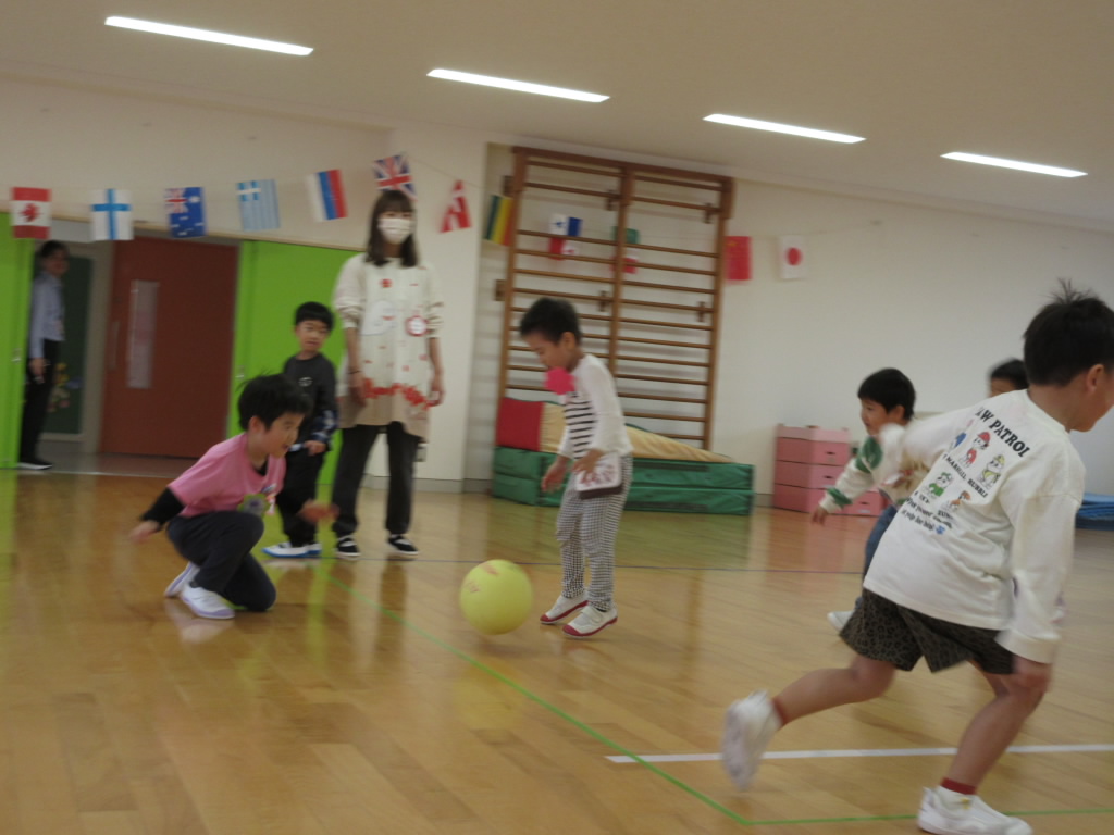 沼垂幼稚園のさくら組の子どもたちが、長嶺保育園の子どもたちに向けて手作り名札をプレゼントし、一気に距離が縮まったところで、遊びが始まりました。一緒にやりたい遊びを見つけて楽しんだり、ボール転がしゲームで思い切り身体を動かしたりして遊びました。