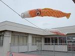 沼垂幼稚園の朝・・。園長先生と肘タッチでスタート。雨空ですが,こいのぼりは元気におよいでいます。