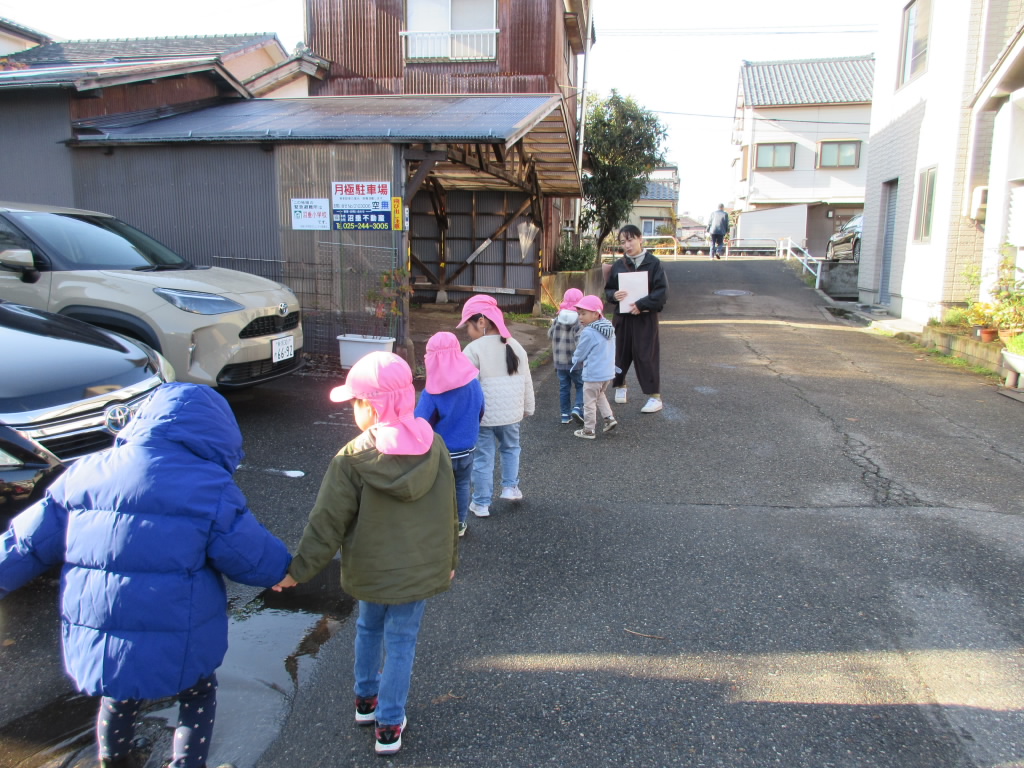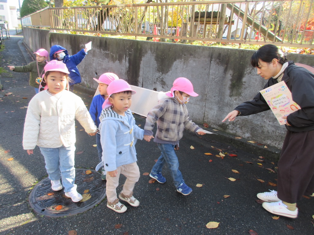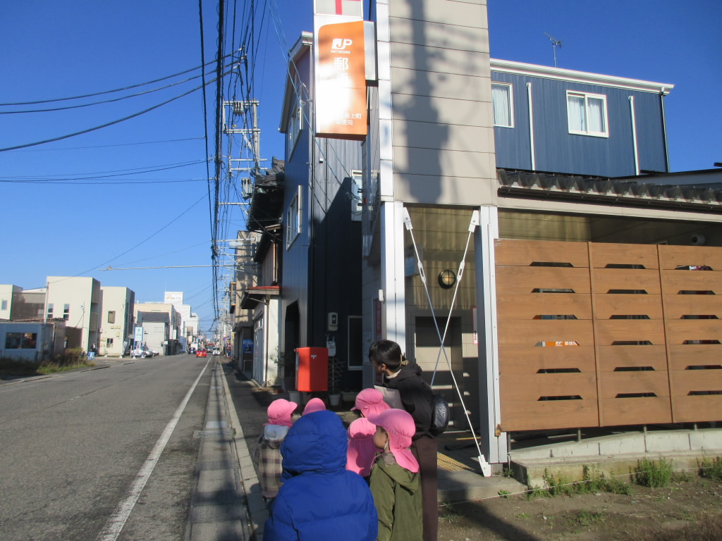 お手紙には切手が必要だね!ポストに入れたお手紙はだれが届けるの?どうやってポストは開けるのかな?等々、気付いたことや不思議に感じたことを友達や先生に伝えながら、みんなで考えていました。地域を散策しながら郵便局まで歩く道のりは、とっても楽しいひとときでした
