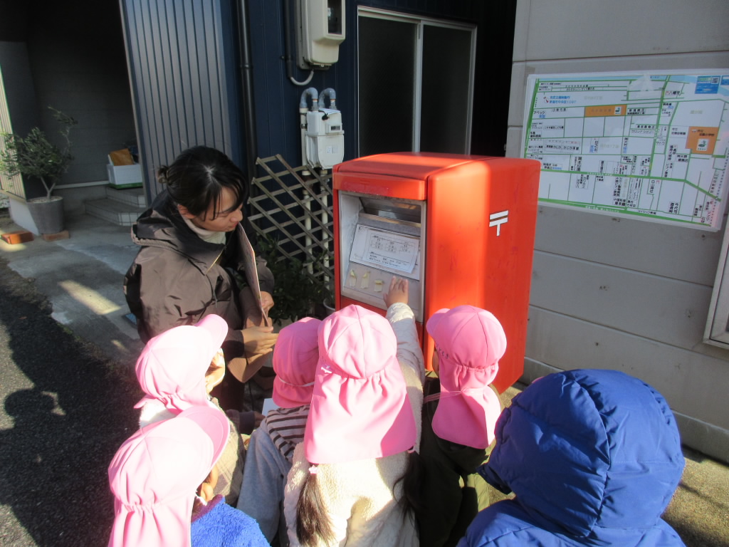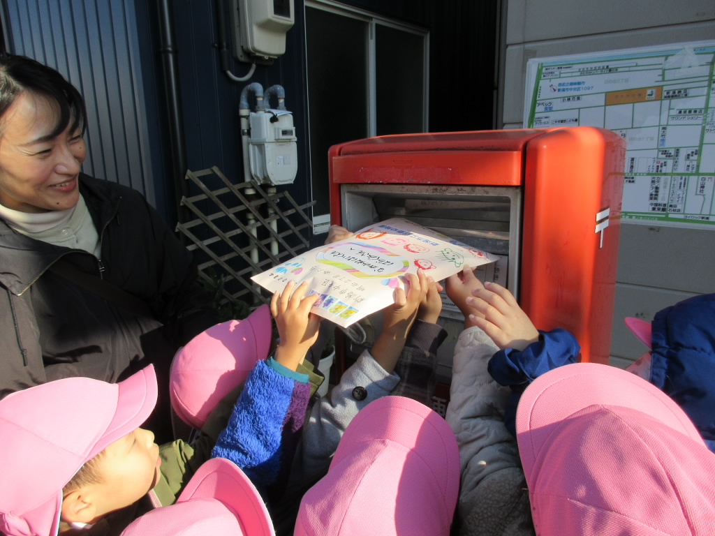年中さくら組の子どもたちは、交流している長嶺保育園の友達に「お手紙を書きたい!」と自分たちで思いついて書いたお手紙を出しに、近くの郵便局まで歩いて行ってきました。