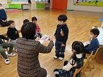 年長組は,おたんじよう月のお友達が得意なことを発表してくれます。「けんぱ・・・けんぱ・・・」リズムよくとんでいます。こちらのお友達は,動物はかせ。いろいろな動物の名前を知っているんですって。そして,その動物にどんな特徴があるかも教えてくれます。さてさて,クイズクイズ・・・。先生が動物の写真を示すと,「それはね・・・」と答えていました。