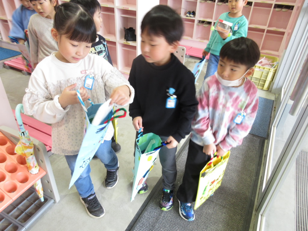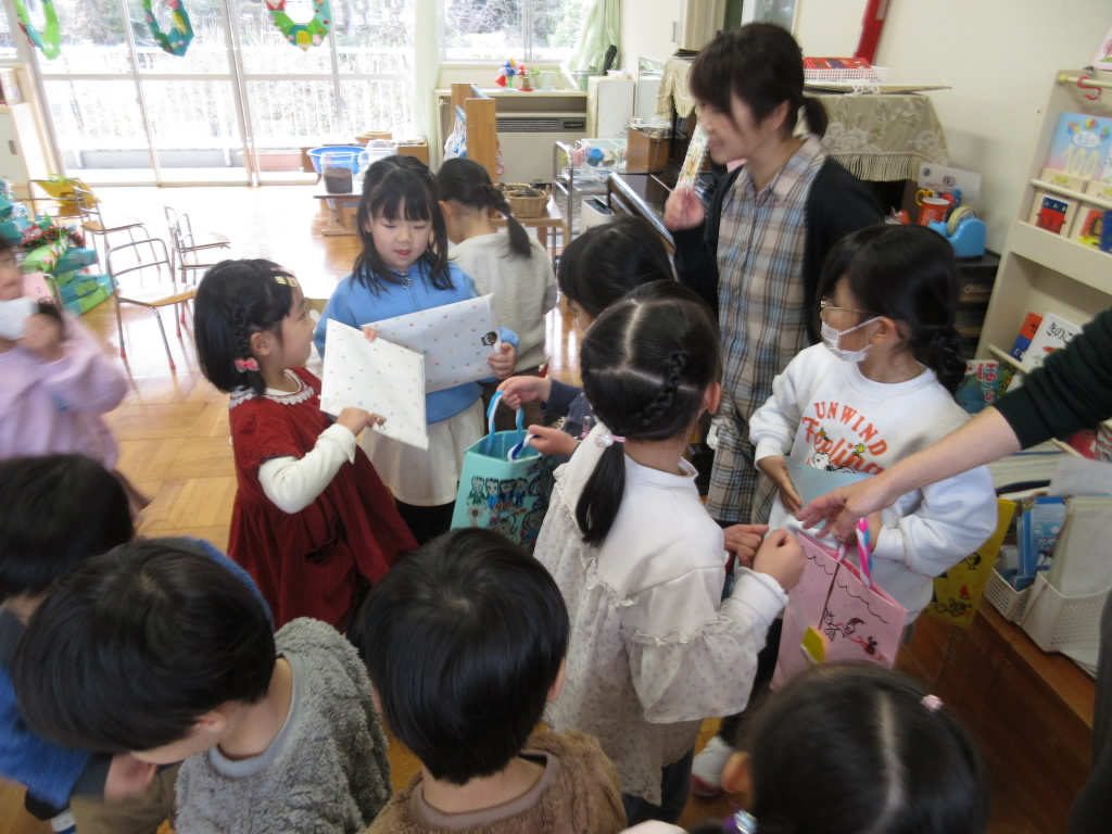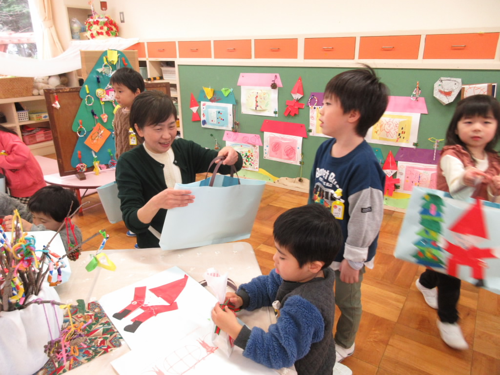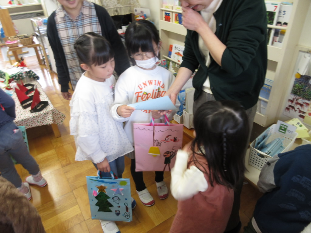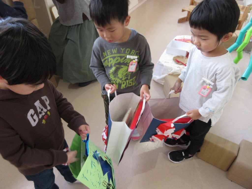 「あれ?窓が開いているよ!」「サンタさんの足跡のにおいがする!」と各保育室へ駆け出して行きました。それぞれが作ったプレゼント入れがふくらんでいる様子にびっくり!「わあ~、見てみて。サンタさんが来てくれたんだねー。」「うれしい!」と大興奮でした。