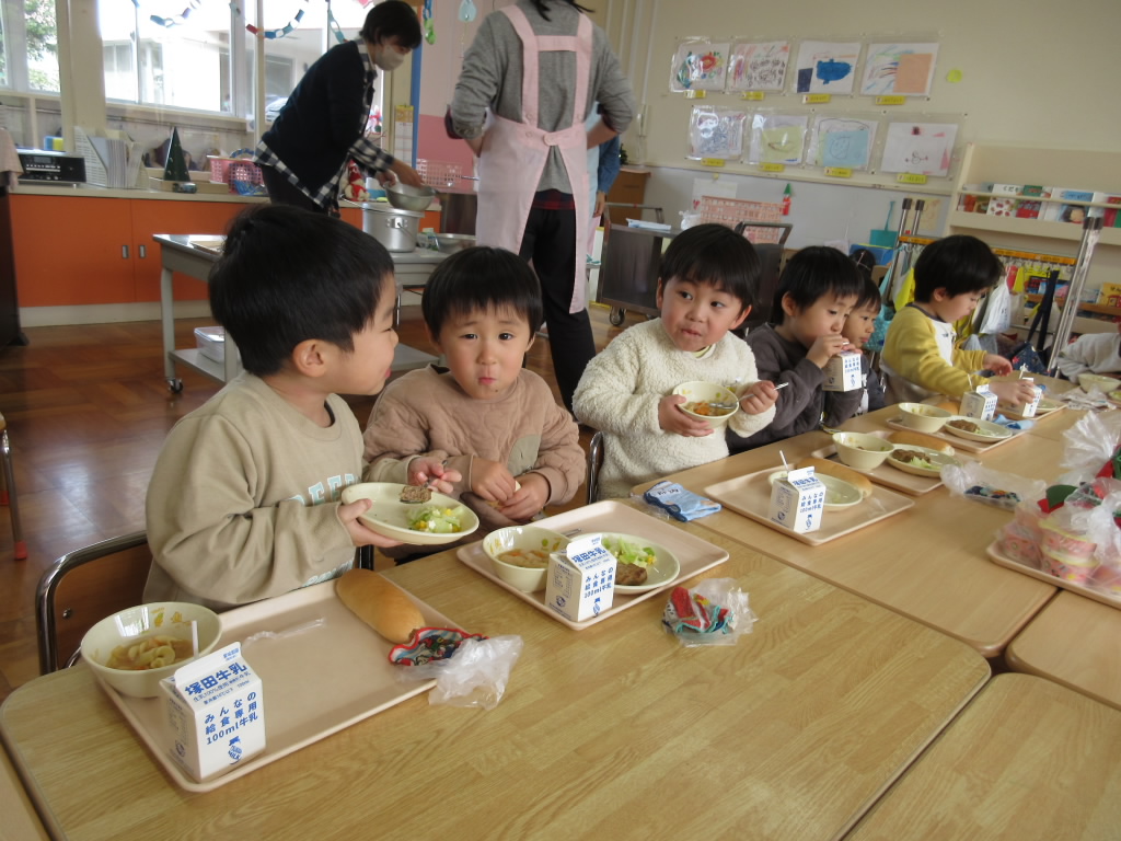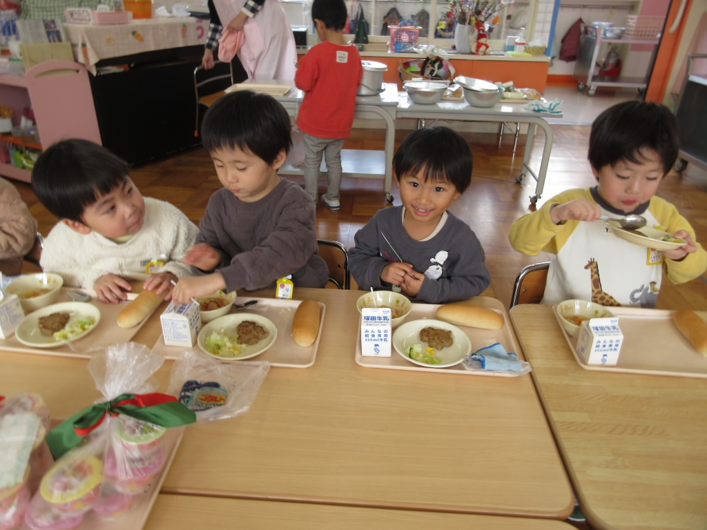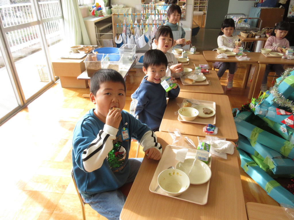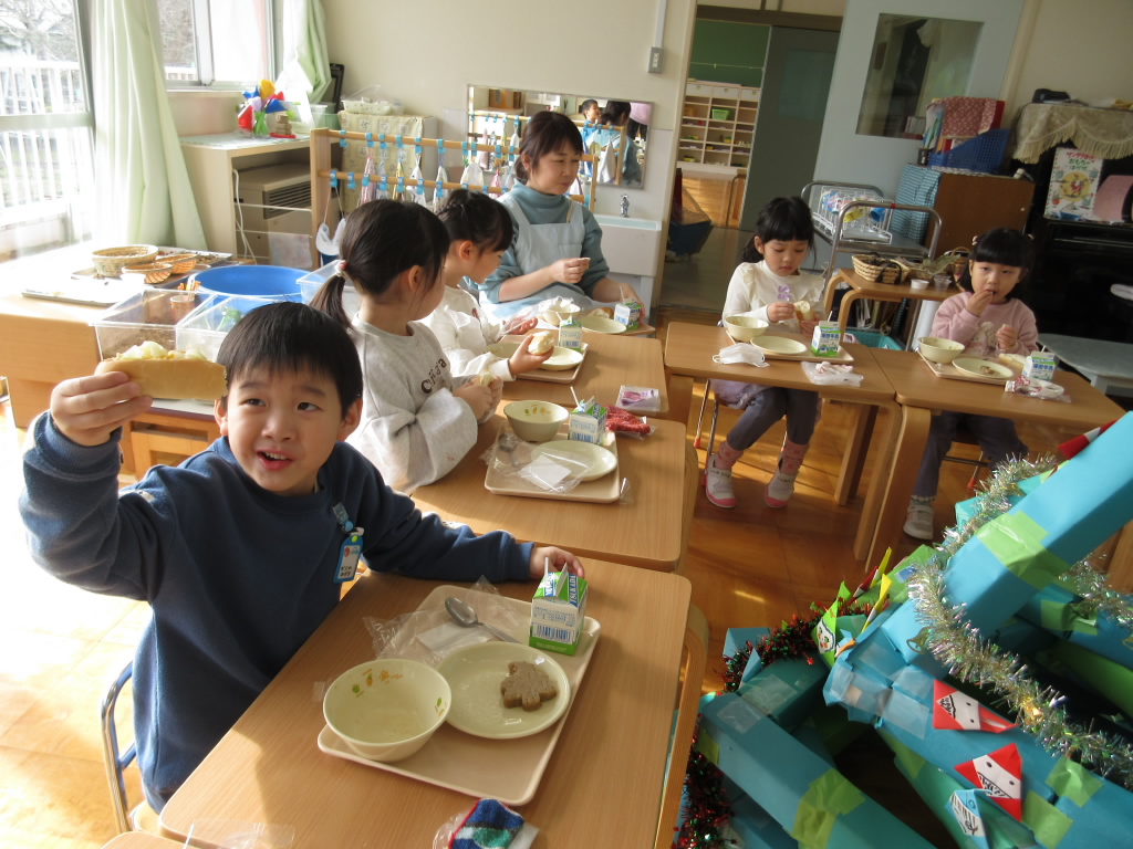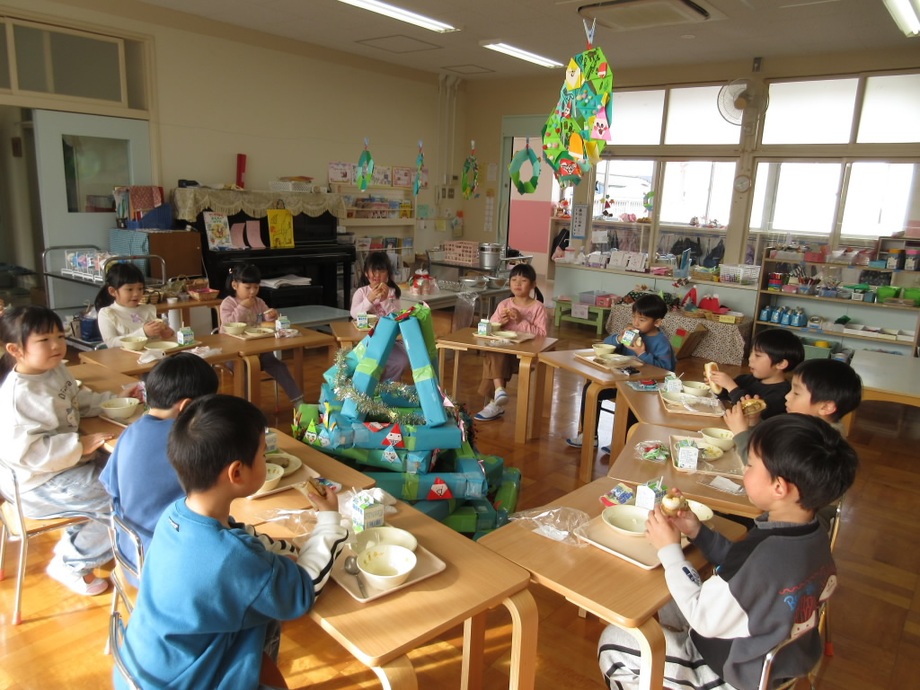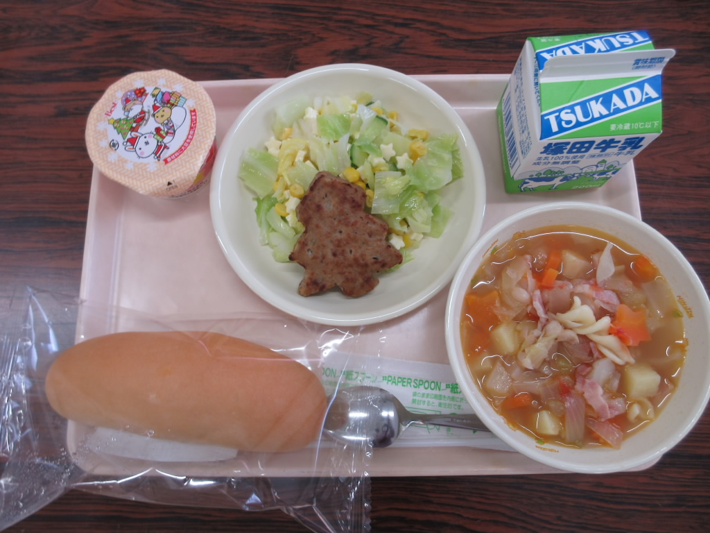 今日は、給食最終日です。もみの木ハンバーグにミネストローネ、クリスマスデザート・・・と子どもたちが大好きなメニューが勢ぞろいでした。パンにハンバーグを挟んで食べる子、サラダに入っている星型のチーズを見つけて大事そうに食べる子など、食べ方はいろいろです。最後はのクリスマスデザートには、調理員さんがクリスマスカラーのリボンを掛けてくださいました。